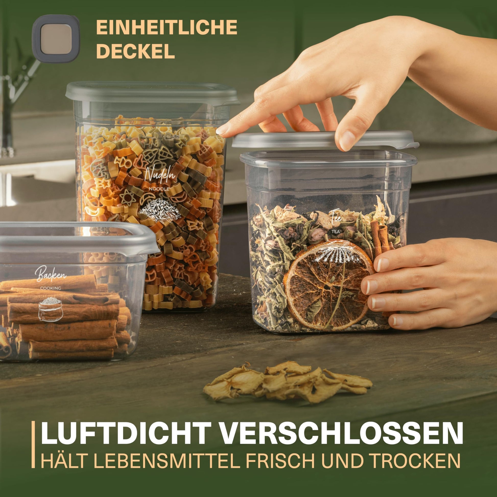 ["CHAOS IN THE KITCHEN CABINETS? With the clever storage container set, you ensure a perfectly organized kitchen! The 15 containers are the ideal solution for stylish storage for spaghetti, sugar, and many other foods.",