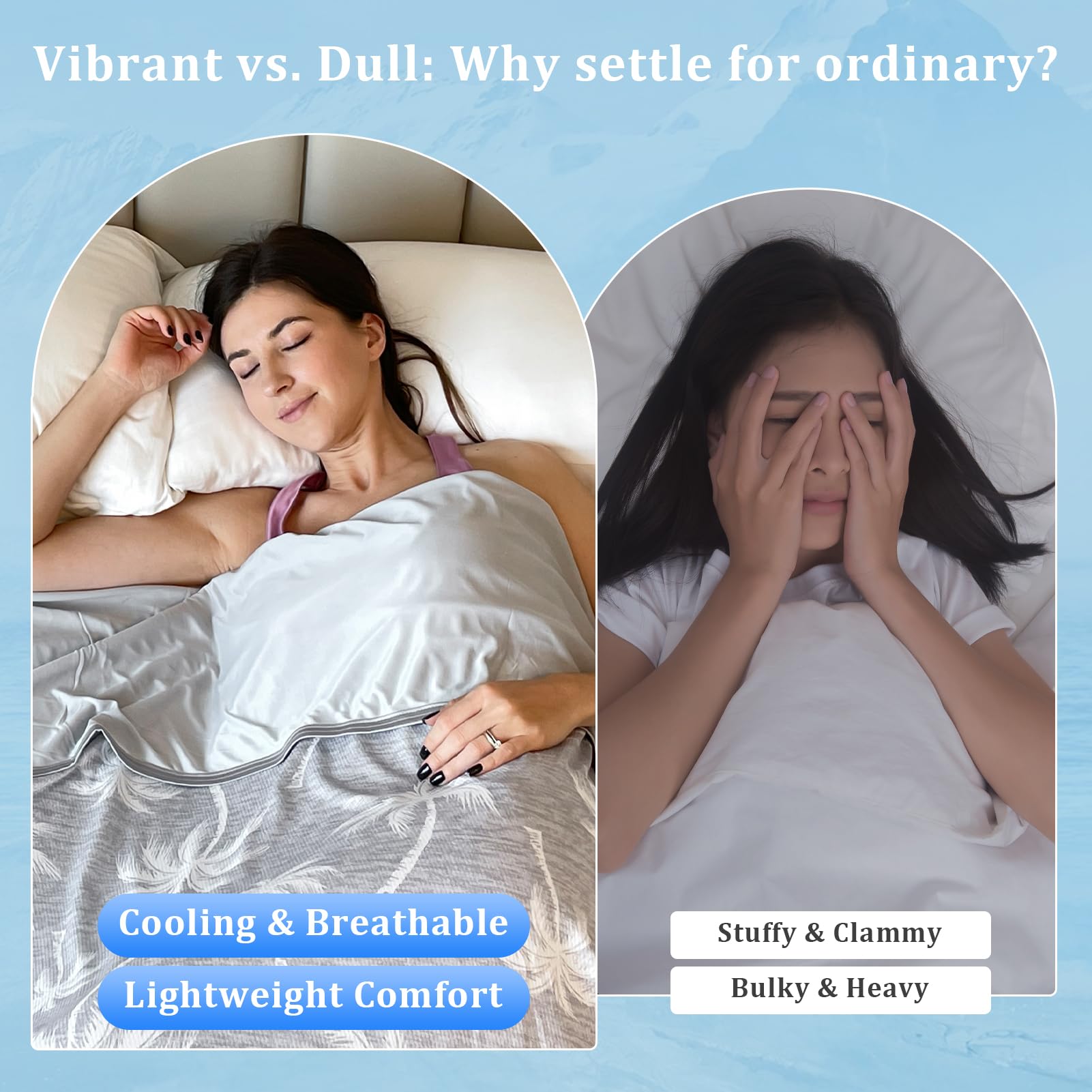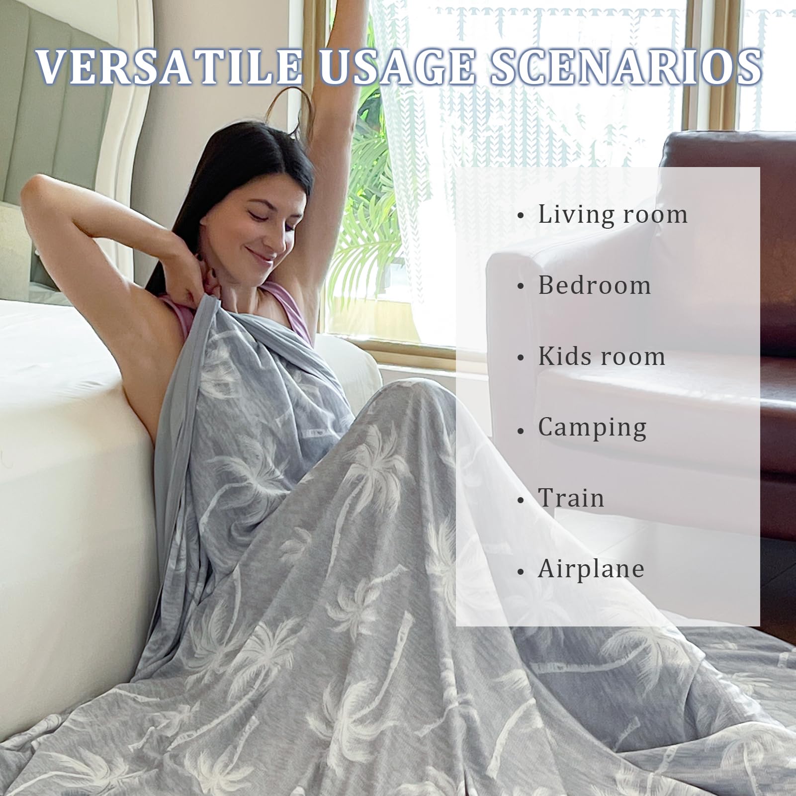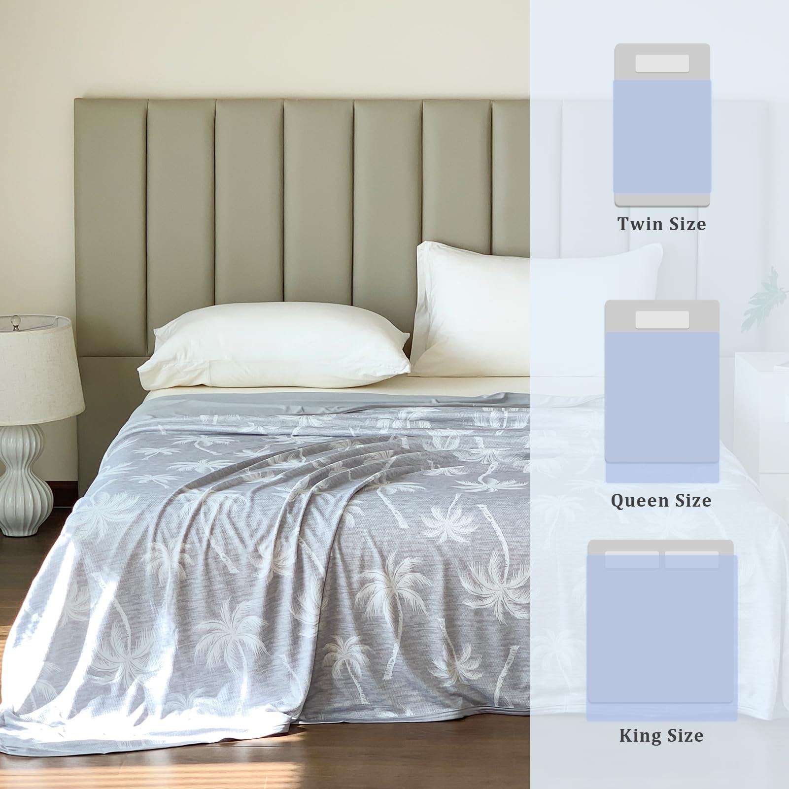 ["Double-Sided Cooling & Tropical Design: VK·LIVING cooling blanket combines style and functionality with its unique palm pattern and offers double-sided cooling fabric, specially designed for hot sleepers. Thanks to its highly conductive material, it efficiently absorbs and dissipates body heat – for cool nights without sweating. Even on the hottest summer evenings: Restful sleep guaranteed.","Breathable & Ultralight: The cooling blanket is specially designed for hot sleepers: Breathable high-tech fibers and ultralight comfort provide sweat-free nights. The lightweight summer blanket with micro-ventilation technology allows air circulation without feeling heavy. Combine the blanket with air conditioning or a fan for enhanced cooling – finally sleep through the night without constantly tossing and turning!","Versatile Cooling Blanket for Any Situation: VK·LIVING cooling blanket against night sweats is perfect for sofa, bed, car, office naps, travel, beach, park – anywhere! The lightweight summer blanket is portable, perfect for daily use.","MULTIPLE SIZE OPTIONS: The cooling blanket is available in Blue and Gray, in three European sizes: 130x150cm, 150x200cm, and 200x220cm. The summer cooling blanket is suitable for babies, children, adults, couples, and seniors – thanks to its skin-friendly softness and flexible sizes, it makes a perfect summer gift for the whole family.","Machine Washable: The cooling blanket for hot sleepers is easy to care for and can be washed by hand or machine. To maintain the cooling performance and durability of the thin summer blanket, wash it gently in cold water – please do not iron or tumble dry. Hang to dry in the shade! The cool summer blanket does not fade or shrink, thanks to reinforced seams and pill-resistant fabric with precise craftsmanship."]