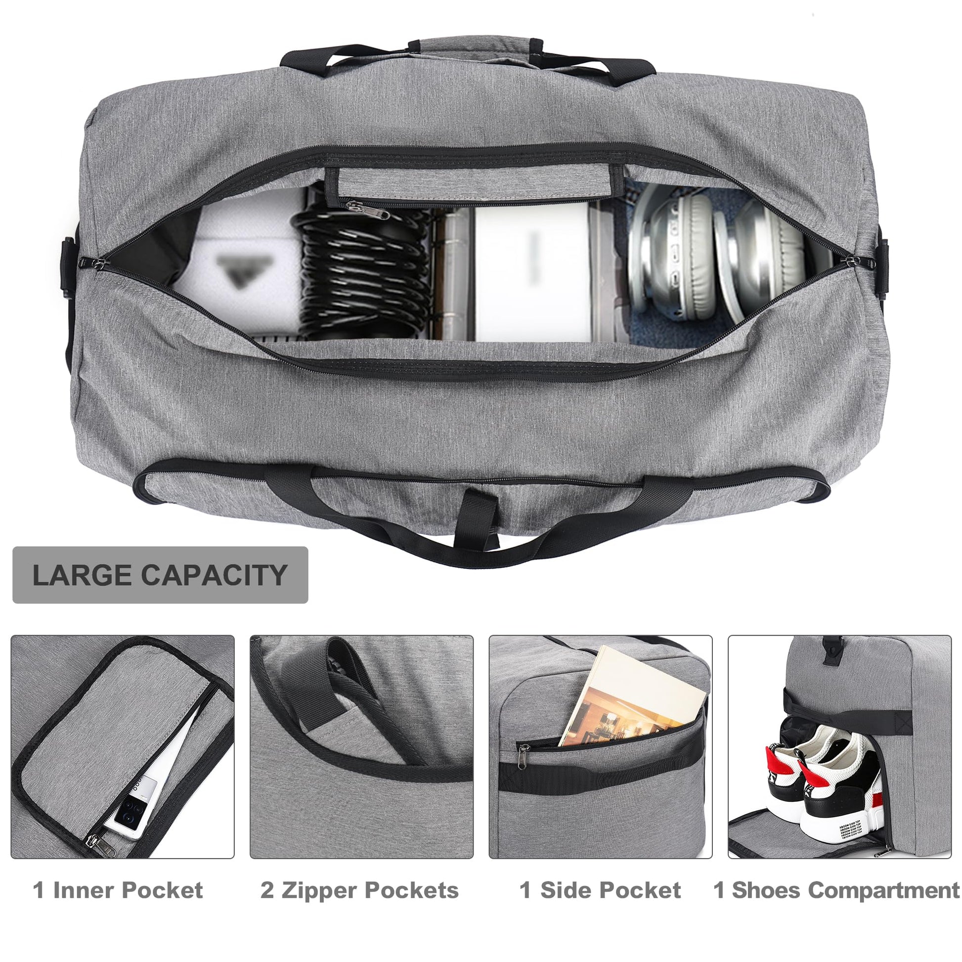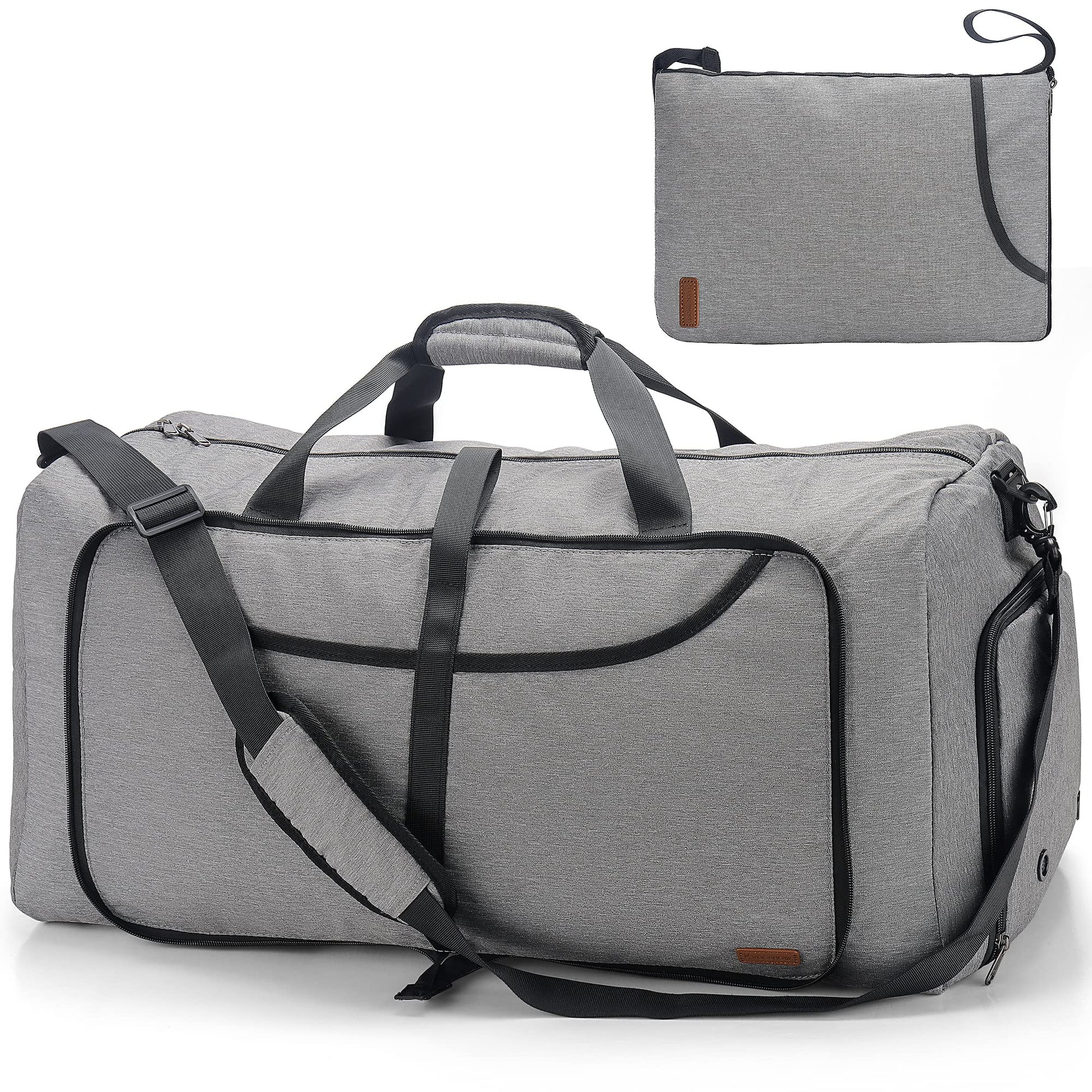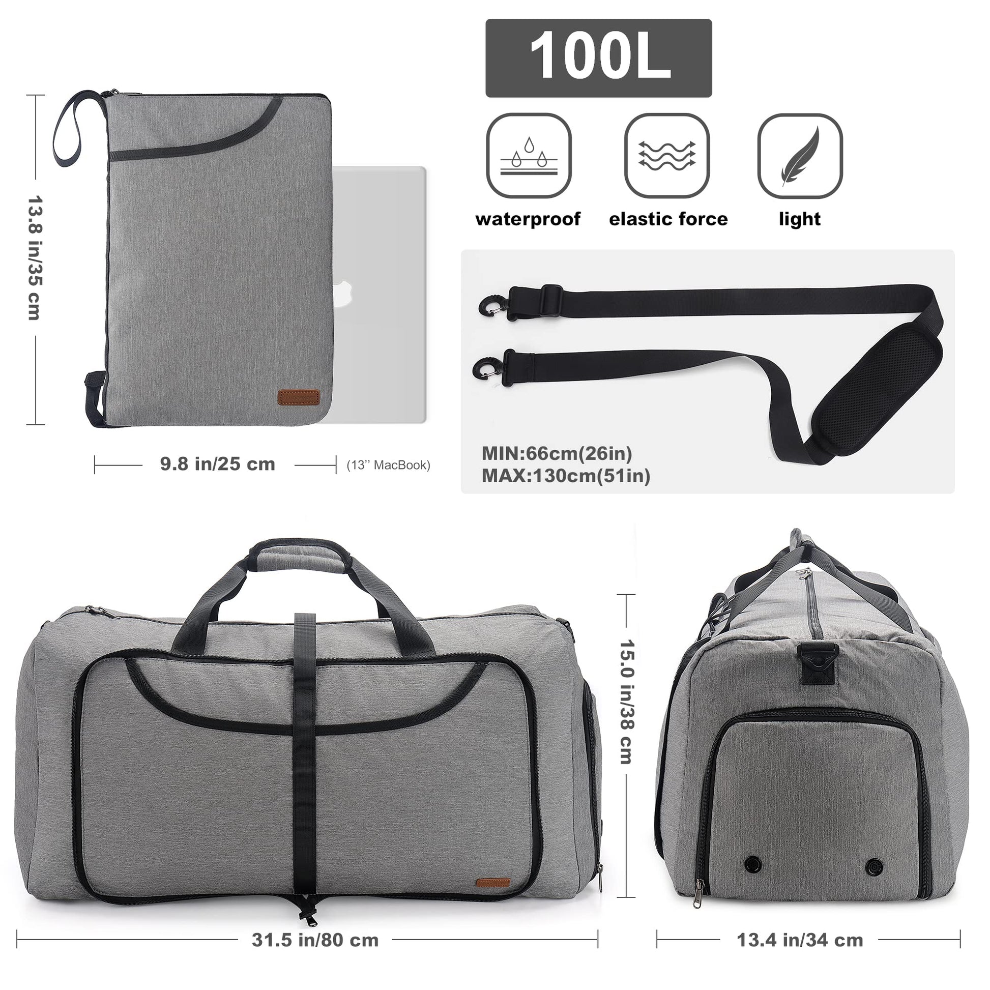 "Oversized Travel Bag 31.5 * 13.4 * 15 inches (L * W * H). The extra large size of 100L can accommodate clothing up to 31.5 inches in height from a luggage case. Whether summer or winter clothing, it can be easily packed and taken with you. It can also be folded up, convenient and practical. The folded size is 14.17 * 10.63 inches (L * W). Multiple pockets including a large main pocket, 2 front pockets, 1 zip pocket on the back wall, and 1 interior zip pocket for secure storage of important items. 1 shoe compartment with ventilation separates wet shoes completely from clothing. Made of high-quality lightweight materials, this kit bag is sturdy and durable. It is made of polyester fabric, waterproof, lightweight, and highly wear-resistant. A travel bag weighs only 0.81kg. The ultra-light weight not only allows for carefree travel, but is also practical in emergencies. The padded soft shoulder strap and carrying handle make it easy to pull a rope and comfort your shoulder and hand. It can also be used as a shoulder bag, handbag, travel bag, sports bag, camping bag, weekender bag, night luggage bag, or compressed to fit in a small locker. Perfect for travel and sports, it is the perfect choice for a simple and stylish travel bag, whether you are traveling or going to the gym. If your suitcase suddenly gets damaged while traveling, this travel bag is a useful replacement bag for your most urgent needs. It is also a great gift for your friends or family."