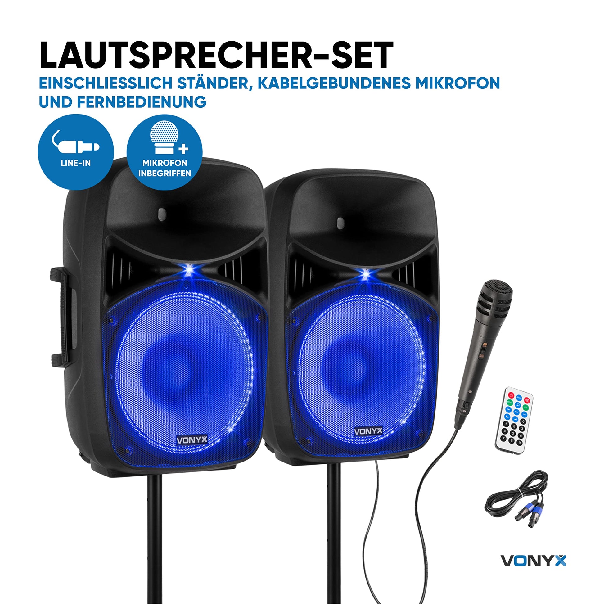 ["Amplifier with speakers: The PA speakers come in a set of 2 with stands - perfect for a party or karaoke night. Ideal for the mobile DJ or a house party - easy and quick operation and transport.", "Powerful active speaker boxes: A must-have for any party - with 1000 watts, this is the perfect DJ set sound system. Built-in LED disco lights in this party box create a great atmosphere.", "Party box with Bluetooth: The Vonyx tripod speaker box set is equipped with a Bluetooth function. This allows you to play your music wirelessly at any time.", "Karaoke box with echo function: These DJ boxes can be used as a karaoke system with a wired microphone. The separately controlled echo function takes your hosting and singing skills to a new level.", "Mobile PA system active: The party boxes with stands have an MP3 player, which allows you to play your favorite music directly from a USB stick or an SD card."]