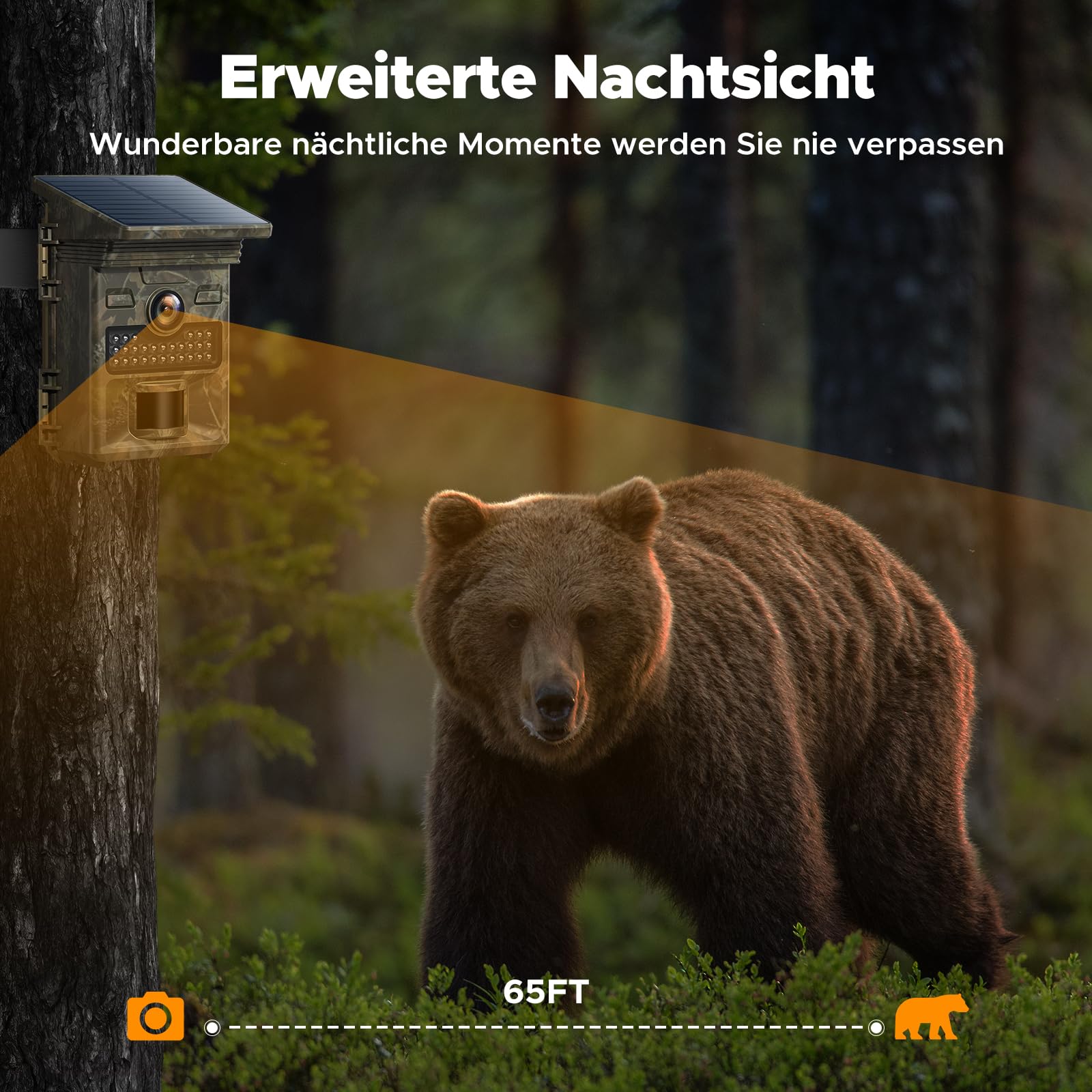 ["Advanced Night Vision & Fast 0.1 Second Trigger"] The trail camera features 26 infrared LEDs, allowing you to capture clear black and white night images up to 65 feet away. With a lightning-fast trigger of 0.1 seconds, you won't miss a single movement in the field. (Note: Trail cameras do not have Wi-Fi)