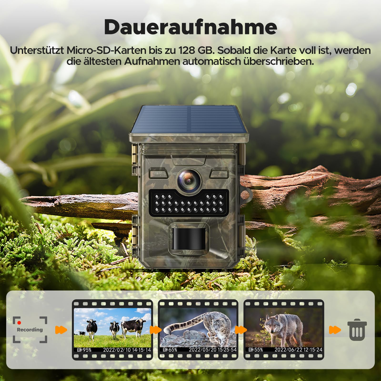 ["Solar Powered Technology & Dual Power Supply"] The solar trail camera is equipped with advanced solar powered technology and offers options for dual power supply. Built-in rechargeable lithium battery with high capacity, which can be easily charged via the top-mounted solar panel. You can also use 4 AA batteries as a backup. You don't have to worry about your trail camera's battery running out.
