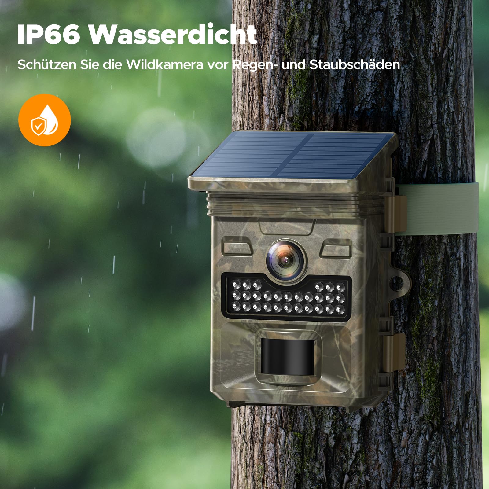 ["Excellent IP66 Waterproofing & Durability"] The solar-powered trail camera is designed to withstand harsh conditions as it is IP66 waterproof and durable. It is made of high-quality materials and state-of-the-art technology, making it suitable for use in rough environments such as rainforests or deserts.