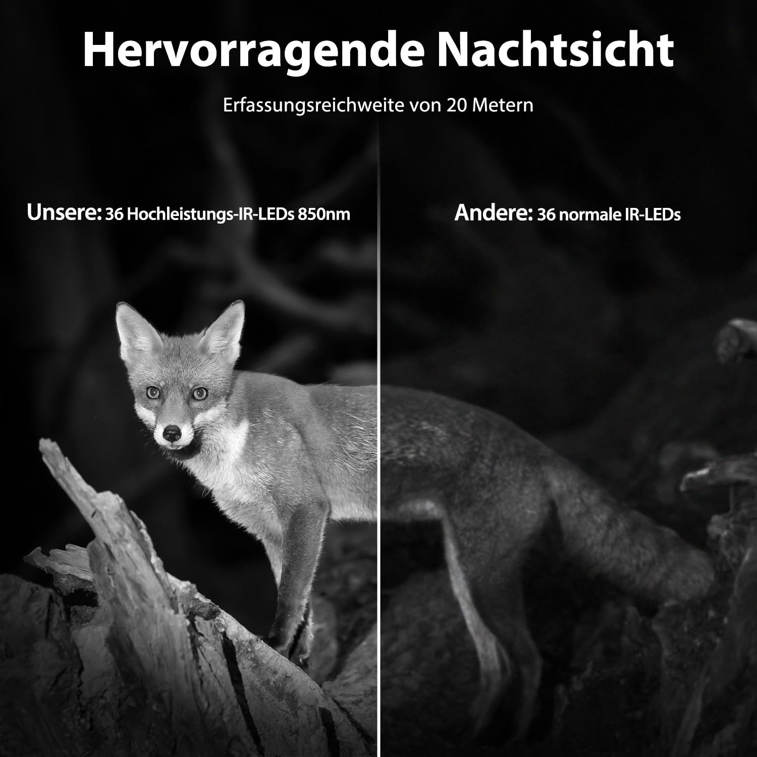 ["Dual Power Supply】The wildlife camera with integrated rechargeable battery can be powered by the solar panel on the top. The built-in battery ensures that the camera never loses power in a sunny environment. It can save a large number of disposable batteries annually while protecting the environment. (Note: Use four AA batteries for better performance in low temperatures.)","【Innovative WiFi Connection & Mobile Transmission】The wildlife camera with mobile transmission app features Super Low-Power WiFi and is compatible with Bluetooth technology. It comes with a free and easy-to-use APP that allows you to operate your cameras even more easily without having to remove the solar wildlife camera and connect a cable. (Note: WiFi connection is limited to 10m.)","【4K/30FPS Ultra HD Video & 85MP Photo】The wildlife camera is equipped with a high-quality optical lens and an advanced image sensor. It can record ultra-high-definition videos at 4K 30fps per second. This solar wildlife camera can capture fascinating moments of wild animals and provide clearer and more vivid details. The video format is MP4.","【H.265 Video Format & Loop Recording】The advanced H.265 video compression saves up to 80% of storage space compared to the MJPEG format of other cameras. The wildlife camera features a unique loop recording function, allowing the camera to continue recording even when the Micro-SD card is full, overwriting old files with new ones. So you won't miss a single beautiful moment.","【0.1s Trigger Time & Excellent Night Vision】With the sensitive PIR sensor, this wildlife camera can capture wildlife at night in just 0.1 seconds when motion is detected. The wildlife camera with motion sensor night vision is equipped with 36 LEDs at 850 nm. The intelligent infrared brightness prevents overexposure, providing clear and balanced night vision."]