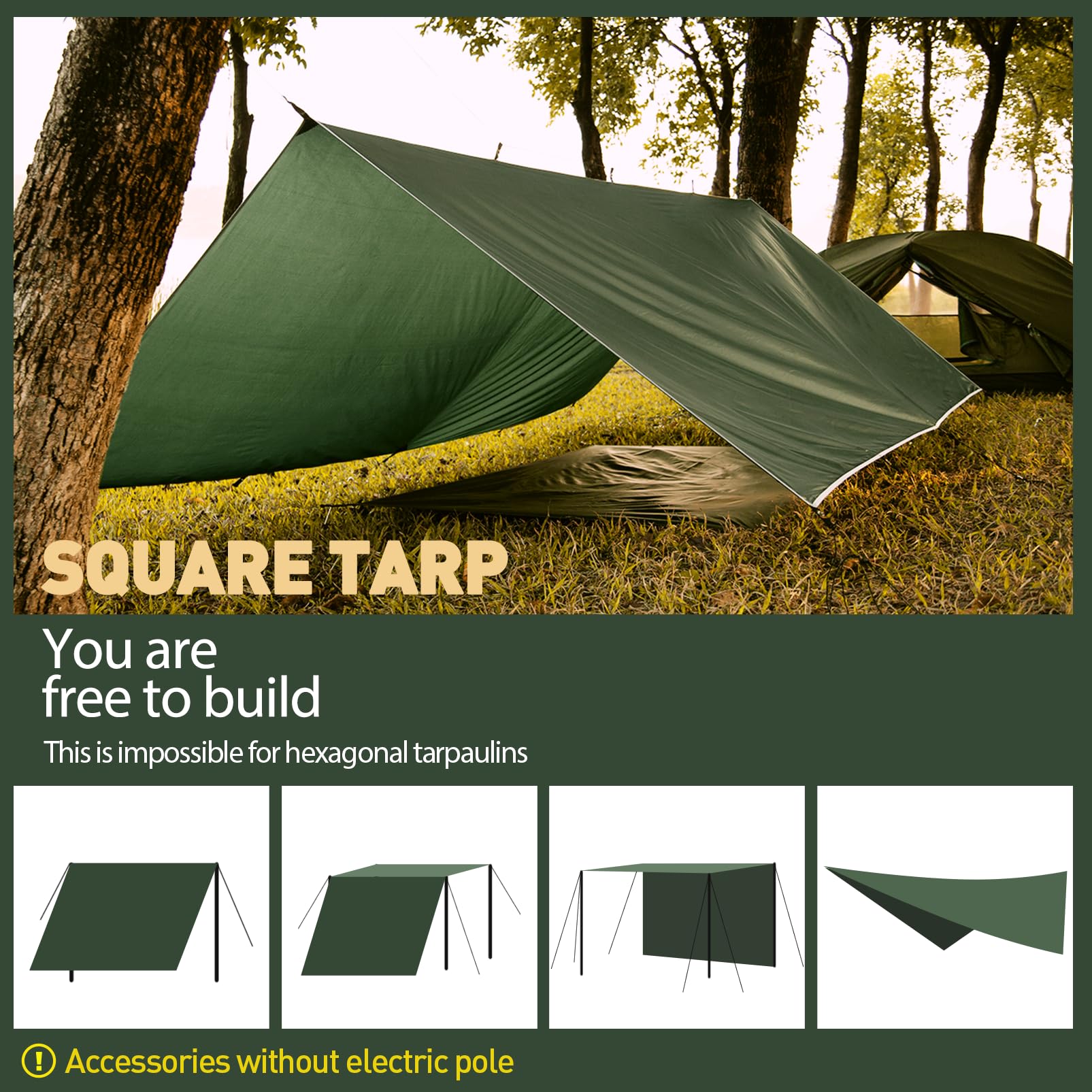 ["EXCELLENT PERFORMANCE: The tarp is made of high-quality 210T polyester fabric with excellent abrasion and tear resistance, so it cannot be easily damaged with prolonged use; with PU 3000 waterproof coating, it achieves excellent waterproof, rainproof, and UV-resistant effects, protecting you from heavy rain, thunderstorms, snow, strong winds, direct sunlight, and other injuries.","ULTRALIGHT OUTDOOR COMPANION: The 3x4 Waterproof Tarp weighs only 2.2 lbs, the package size is 10.6 x 5.5 x 5.5 inches, you can easily carry it or put it in your backpack. Whether as a picnic mat for family outdoor activities, as a sunshade for outdoor camping, BBQ, etc., or as a tent floor mat, hammock cover, etc., our camping tarp can be built in various shapes according to your needs.","PERFECT CRAFTSMANSHIP: We are committed to providing our customers with high-quality products. Each tarp is equipped with 15 metal corner holes and each corner strap is made of embedded PE patches (thickened). The edge seams and tension points are extra double reinforced, and the top seam is treated with a double layer of anti-leakage, super tear-resistant and durable.","HIGH-QUALITY COMPLETE ACCESSORIES: Equipped with Tarp*1, Storage bag*2 (one large and one small), Aluminum stakes*6, Nylon rope*8 (157.5 inches). The guyline comes with buttons that can make it more stable and not easily fall off. The small storage bag is used to store the aluminum spikes, the large storage bag is used to keep everything neatly stored together to avoid loss or confusion.","QUALITY CUSTOMER SERVICE: If you encounter any problems, please do not hesitate to contact us. We will respond within 24 hours and provide professional and high-quality customer service to solve your problems in a timely manner."]