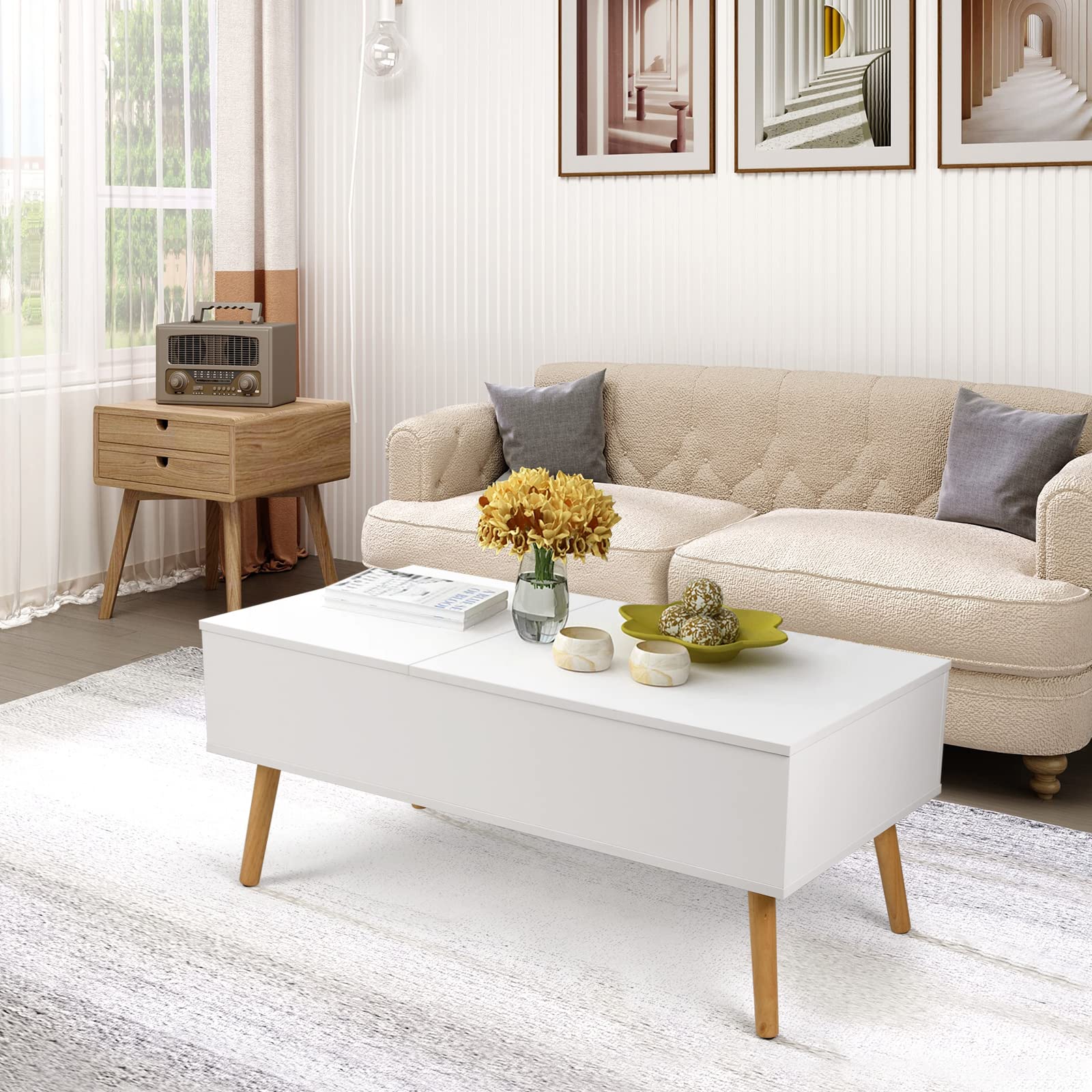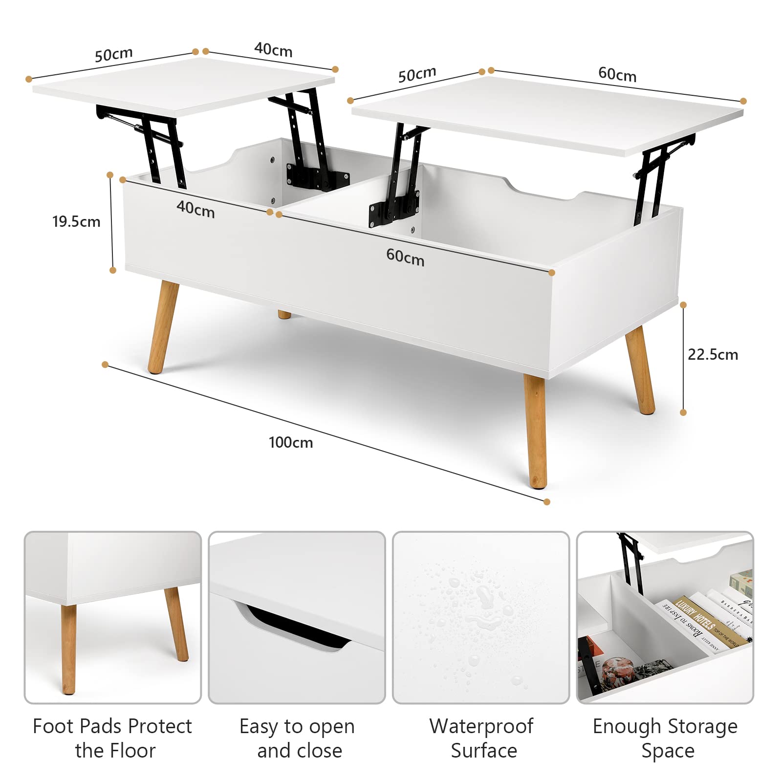 ["【ADJUSTABLE DESK】 The tabletop can be easily lifted up to provide you with a working surface. 2 foldable panels provide space for 2 people at the same time, so you can write, use your laptop, or eat at the table without having to bend over. When you're not working, simply fold down the tabletop, and you can use it as a regular coffee table.","【PNEUMATIC RODS】 Compared to traditional spring-loaded lifting mechanisms, the pneumatic rods make the table lifter smoother, quieter, safer, and more user-friendly.","【LARGE STORAGE SPACE】 This practical coffee table offers you 2 additional hidden storage compartments to keep your daily items organized and also meet your storage needs.","【HIGH-QUALITY MATERIAL】 This coffee table is made of high-quality MDF wood panels and solid wood legs, each equipped with non-slip feet pads to prevent the floor from being scratched when moving the coffee table.","【EASY TO ASSEMBLE】 All necessary accessories and a clear instruction manual are included, allowing for a quick and easy assembly. Product size: 100.5CM(L) X 50.5CM(W) X 43.5CM(H)."]