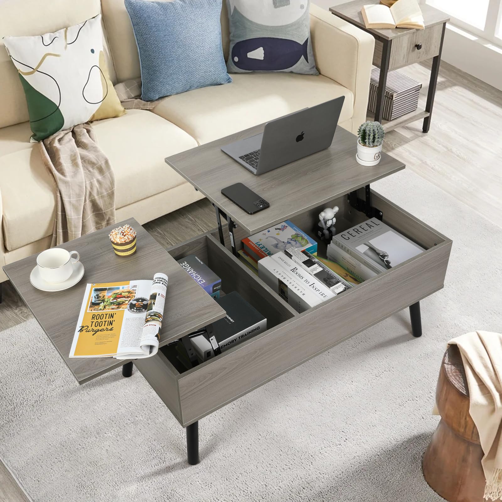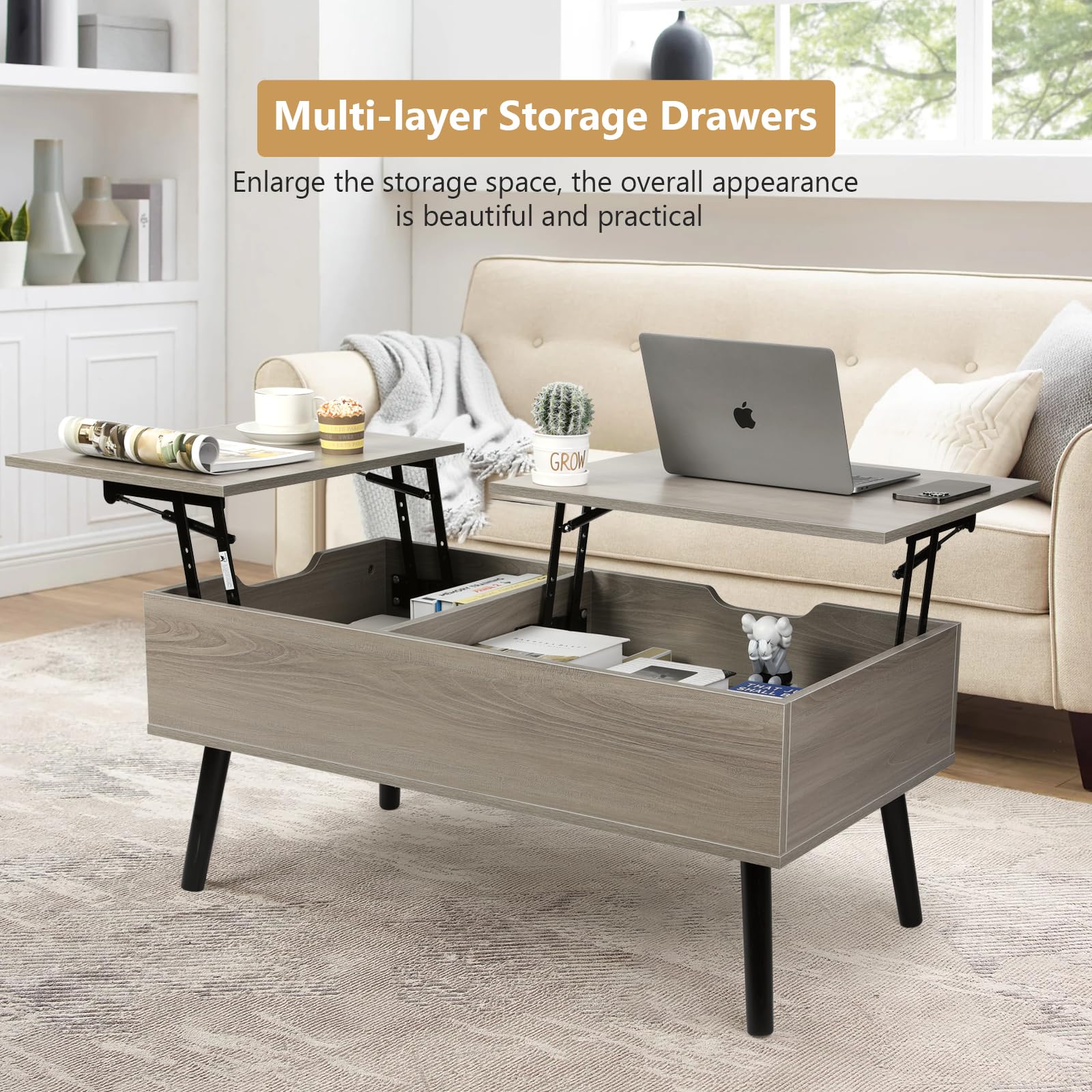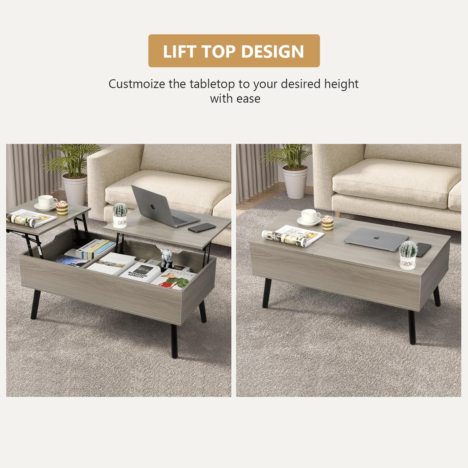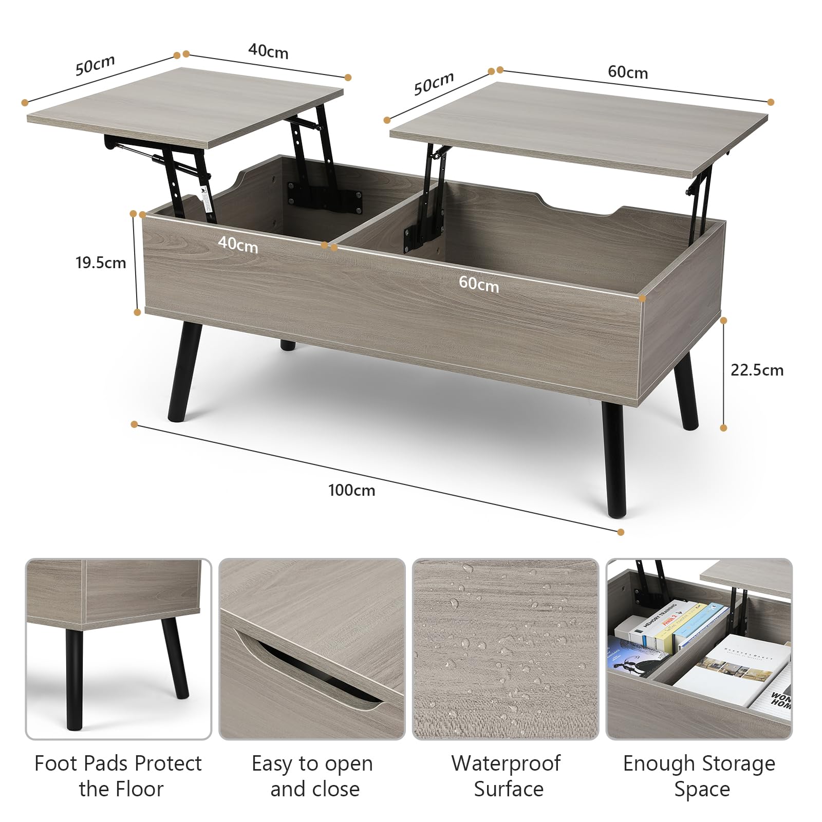["【ADJUSTABLE DESK】 The tabletop can be easily lifted up to provide you with a work surface. 2 foldable panels allow space for 2 people to use at the same time, so you can write, use your laptop, or eat at the table without having to bend over. When you're not working, simply fold down the tabletop, and you can use it as a normal coffee table.","【PNEUMATIC RODS】 Compared to traditional spring-loaded lifting mechanisms, the pneumatic rods make the table lifter smoother, quieter, safer, and more user-friendly.","【AMPLE STORAGE SPACE】 This practical coffee table offers you 2 additional hidden storage compartments to keep your daily items tidy and also meet your storage needs.","【HIGH-QUALITY MATERIAL】 This coffee table is made of high-quality MDF wood panels and solid wood legs, each equipped with non-slip foot pads to prevent scratching the floor when moving the coffee table.","【EASY TO ASSEMBLE】 All necessary accessories and a clear instruction manual are included, allowing for quick and easy assembly. Product size: 100.5CM(L) X 50.5CM(W) X 43.5CM(H)."]