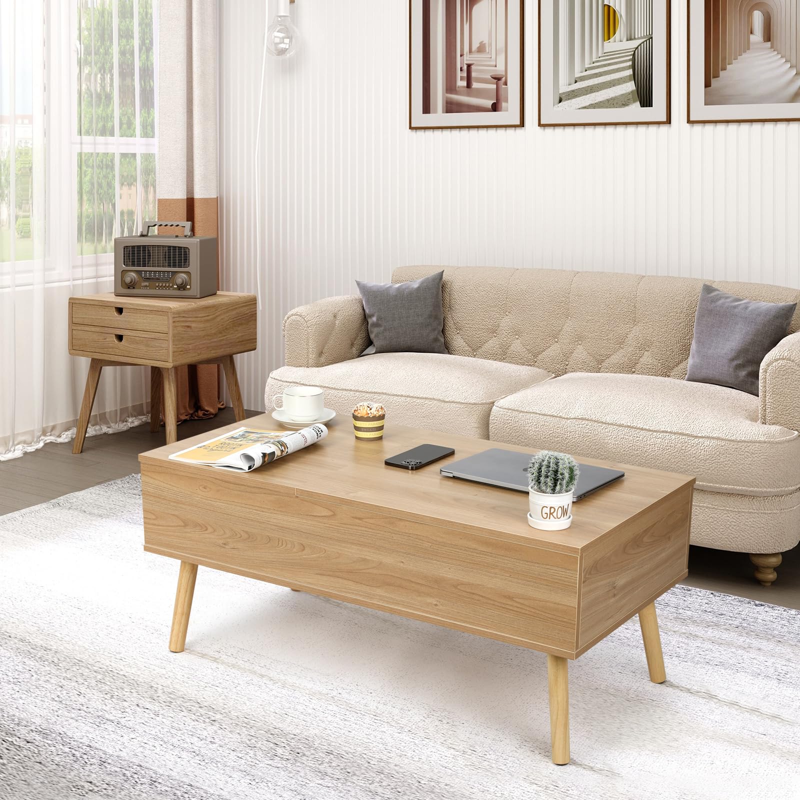 ["ADJUSTABLE DESK"] The tabletop can be easily lifted up to provide you with a work surface. 2 foldable panels can accommodate 2 people at the same time, allowing you to write, use your laptop, or eat at the table without having to bend over. When you're not working, simply fold down the tabletop and you can use it as a regular coffee table.["PNEUMATIC RODS"] Compared to traditional spring-loaded lifting mechanisms, the pneumatic rods make the table lifter smoother, quieter, safer, and more user-friendly.["AMPLE STORAGE SPACE"] This practical coffee table provides you with 2 additional hidden storage compartments to keep your daily items organized and also meet your storage needs.["HIGH-QUALITY MATERIAL"] This coffee table is made of high-quality MDF wood panels and solid wood legs, each equipped with non-slip foot pads to prevent scratching the floor when moving the coffee table.["EASY TO ASSEMBLE"] All necessary accessories and a clear instruction manual are included, allowing for quick and easy assembly. Product size: 100.5CM(L) X 50.5CM(W) X 43.5CM(H).