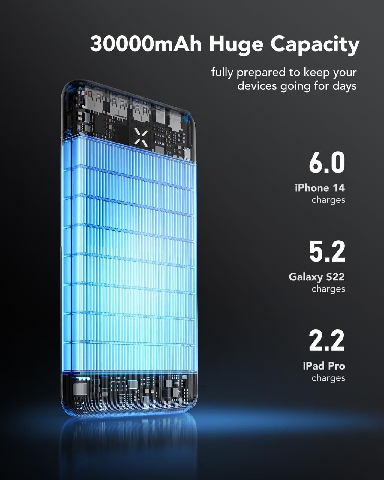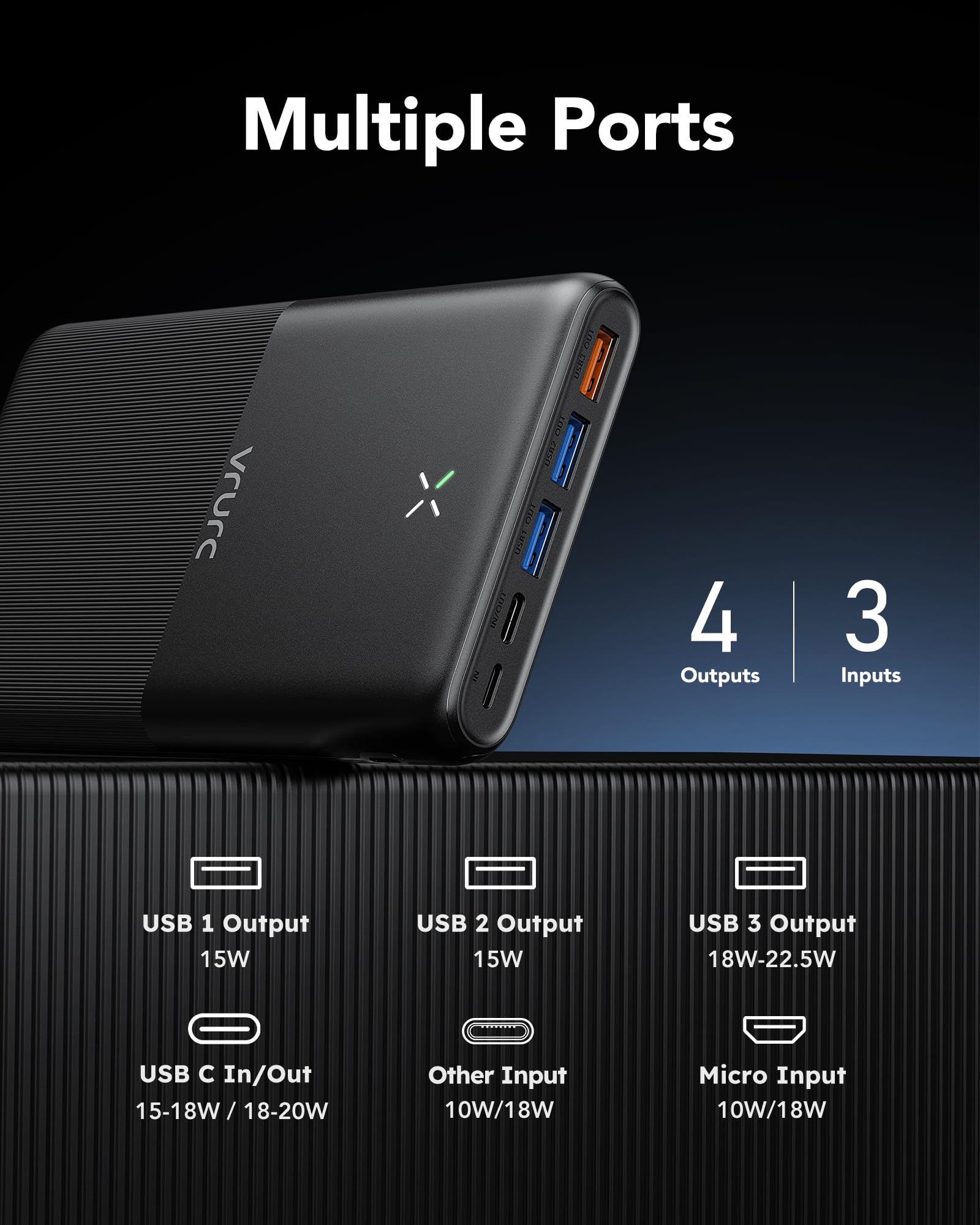 VRURC Power Bank 30000mAh 22.5W Portable Charger USB C Fast Charging External Battery Packs with 4 Outputs and 3 Inputs Compatible with iPhone, Huawei, Tablets, etc. (Black)