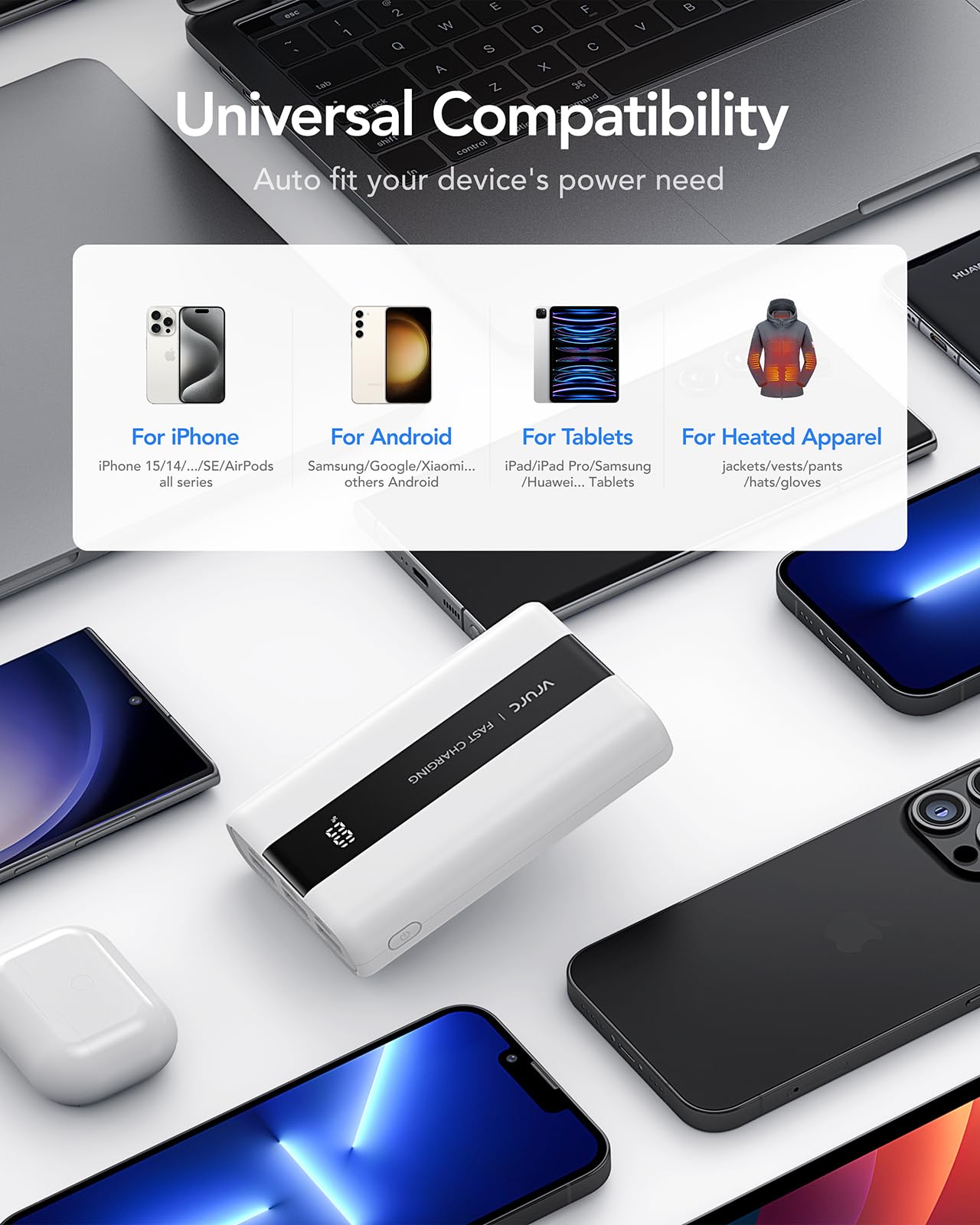 ["🔋【22.5W Power Bank Fast Charging】The power bank features a PD 3.0 20W USB-C port for fast charging, as well as a 22.5W USB-3 port for rapid charging, allowing your phone to reach 60% in just 30 minutes, completely changing your speed experience","🔋【High Capacity and Ultra-Compact】The small 20000mAh power bank can charge the iPhone 12 4.5 times and the Samsung S9 4 times, making it perfect for camping, travel, or indoor use","🔋【4 Output Methods】Portable battery pack with a total of 4 output ports (1 22.5W USB-3, 1 20W Type-C, and 1 12W USB-1 and 1 USB-2). The power bank supports simultaneous charging of 4 devices","🔋【3 Input Methods】The USB C power bank has 3 input ports (1 18W Micro, 1 18W USB-C, 1 18W compatible iPhone). Use the fast charging cable and 9V/2A adapter to quickly charge the power bank, taking only 6 hours for full charge (ordinary 5V/3A adapter fully charges in 9 hours)","🔋【Compact and Portable External Battery】The VRURC 20000mAh power bank measures only 10.7 * 6.95 * 2.5cm and weighs just 283g. The excellent travel battery is easy to carry, keeping your multiple devices charged all day with a full 20000mAh charge","🔋【Wider Compatibility & LED Display】The portable charger PD 20W is not only suitable for all smartphones and tablets, but can also charge AirPods, Bluetooth headsets, smartwatches, and other small devices. The LED display allows you to accurately check the remaining power at any time","🔋【What You Get】1 x airline-approved 20000mAh power bank, 1 x cable, 1 x user manual, 1 year warranty and lifetime technical support","🔋【Safe Charging Protection】The portable external battery pack has passed CE, FCC, and other safety protection certifications, featuring overcharge, over-discharge, and short circuit protection."]