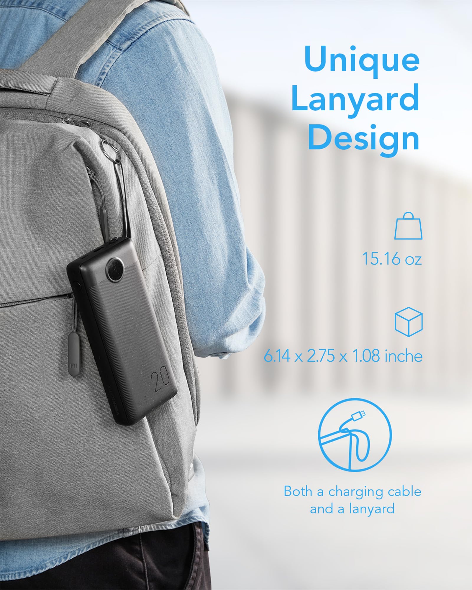 "🔋【Portable Size and Unique Lanyard Design】 This external battery measures 15.6 * 7 * 2.6cm and weighs about 430g. Built-in Micro-USB charging cable can not only be charged but also be used as a lanyard on the backpack for easy carrying",
