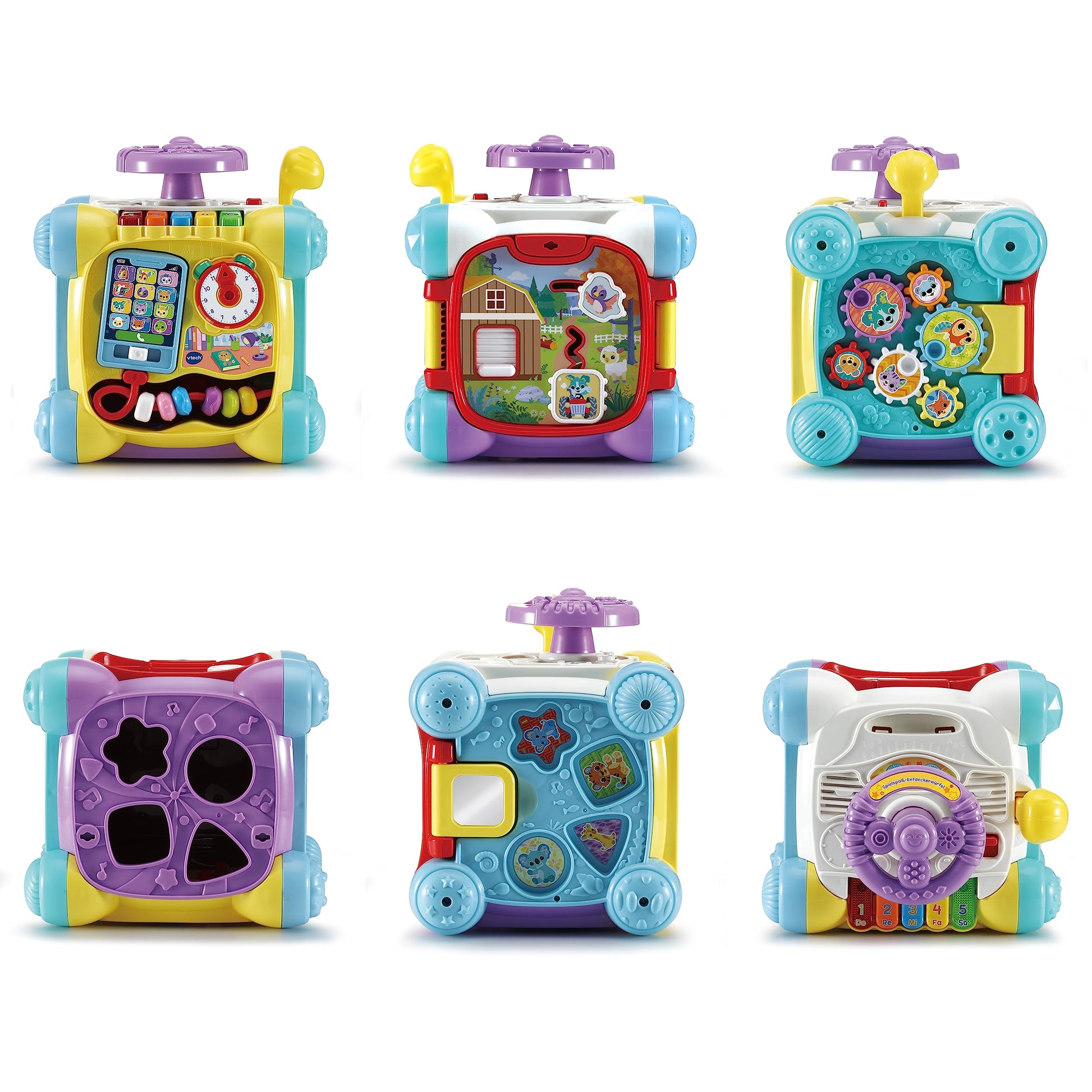 ["6 pages of play and learning fun: With the discovery cube and numerous elements to press, turn, and slide, boredom is guaranteed not to arise","On each page, there is an interactive game with movable game elements to discover the themes of city, ocean, forest, desk, driving, and shapes","The different cube sides with learning content on numbers, colors, times, animals, and much more ensure varied gaming fun","The sturdy toy with 5 sung songs and 15 melodies trains motor skills, language development, and sensorimotor skills and invites exploration and discovery","Scope of delivery: 1 x VTech Baby Play and Discovery Cube / Child-safe battery compartment, volume control, and automatic shutdown / German version / Age: 12-36 months / 2 x AA/LR6 demo batteries / Art. No.: 80-557204"]
