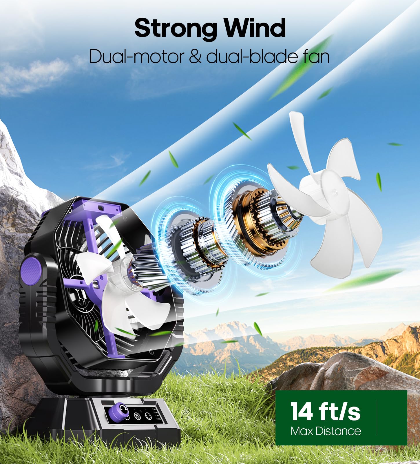 ["New Upgraded Dual Blade & Dual Motor Design】 Our camping fan features two brushless motors and an advanced dual-5-blade design, giving it stronger wind power than similar fans and can deliver 200% stronger wind power, making you feel cool with quick cooling in hot summer. Perfect for use while camping, fishing, or camping.