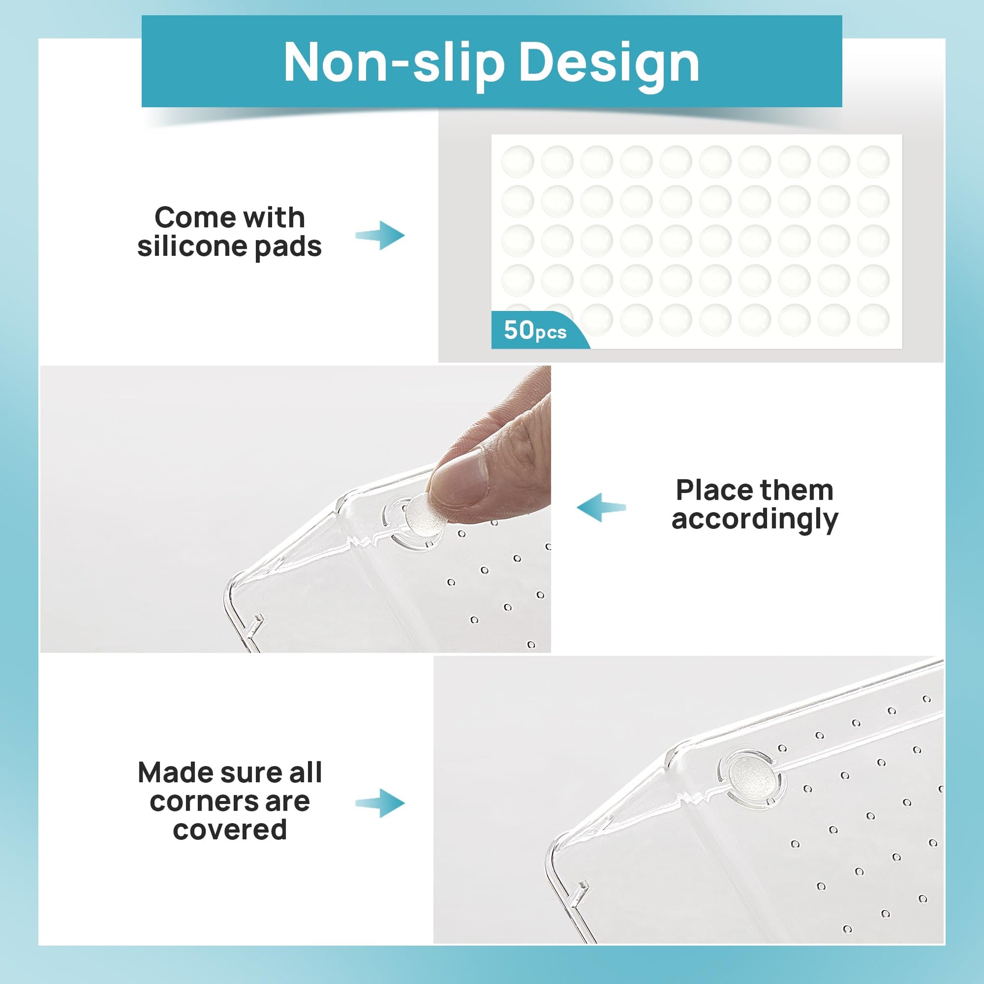 ["Non-slip and durable"] 50 extra silicone pads are included. Simply stick them to the bottom of the plastic trays to make them more non-slip. Made of sturdy and transparent plastic so you can see what's inside without rummaging around or creating clutter, allowing you to lead a tidy lifestyle.