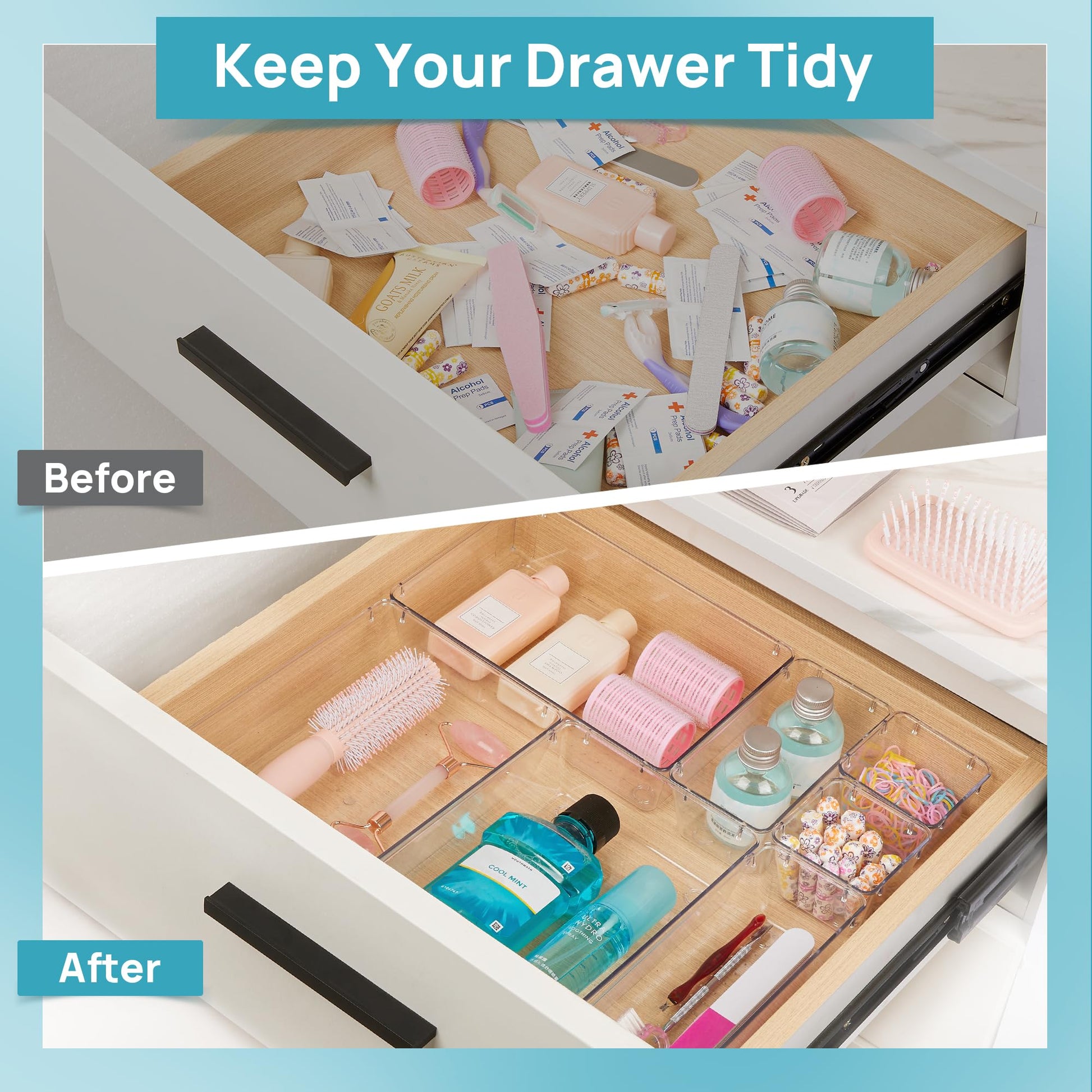 ["Make everything organized"] These transparent, versatile makeup drawer organizers are perfect for home organization. Suitable for all types of drawers, such as vanity/bathroom/kitchen/office drawers/craft room, great for organizing cosmetics, makeup tools, hair accessories, jewelry, pins, office supplies, craft supplies, utensils, etc.