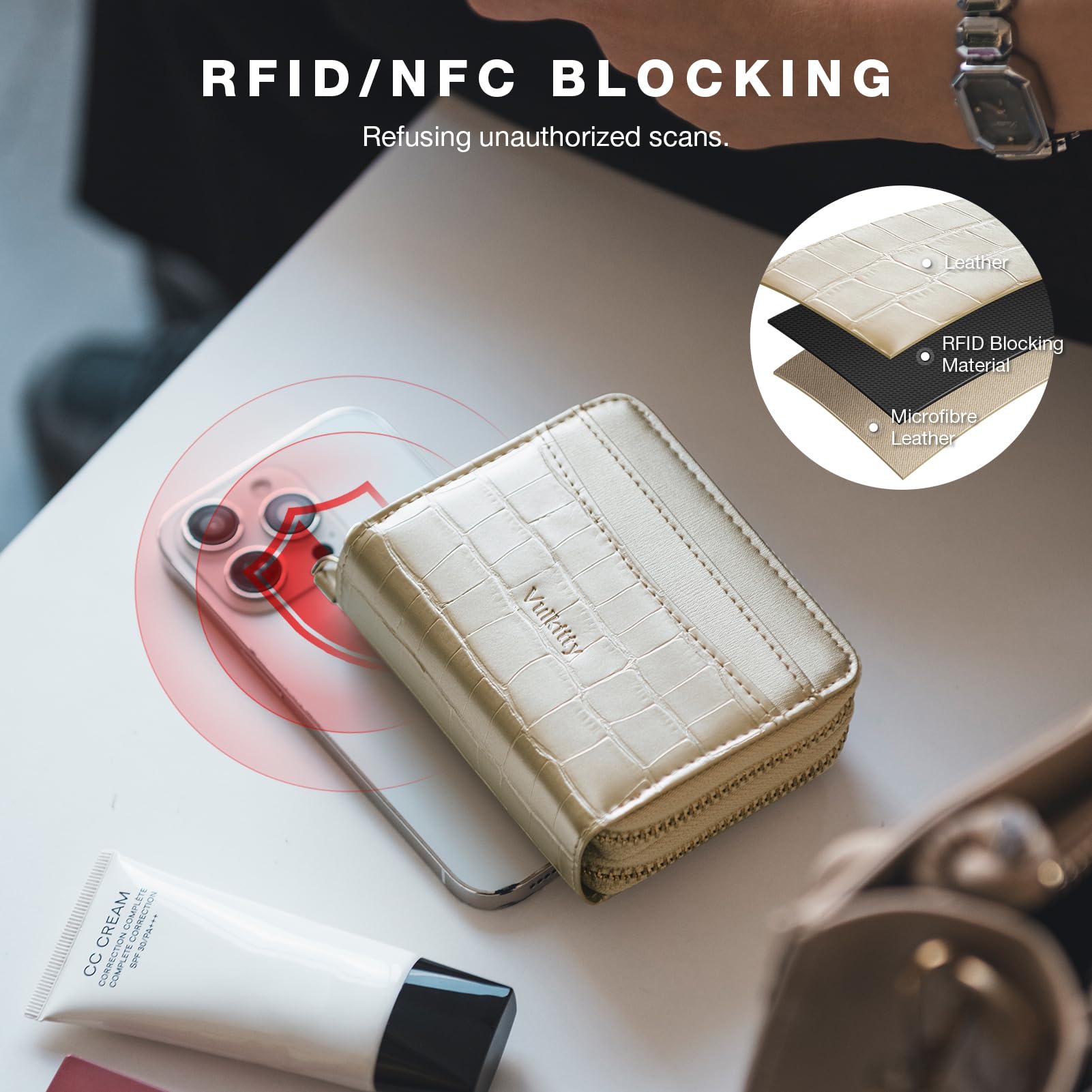 "RFID BLOCKING AND DATA PROTECTION - The women's accordion card holder is equipped with advanced, unique, proprietary blocking material that blocks RFID signals and protects valuable private information stored on RFID chips from unauthorized scans.