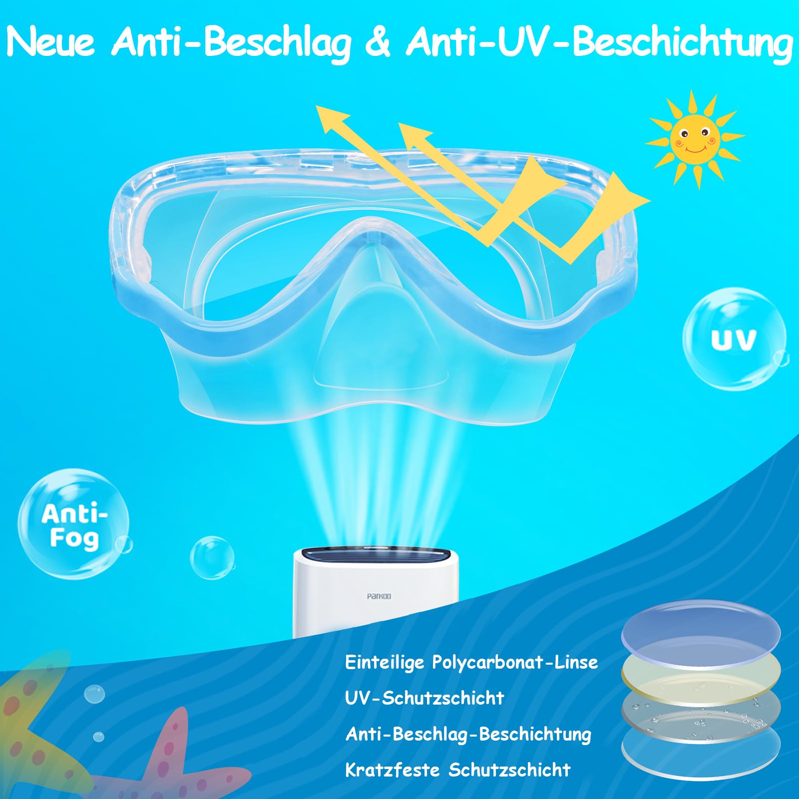 ["⚠️ NOTE: EU design patent applied (No. 015096215-0001). Plagiarism will be legally prosecuted. 🐋【enhanced shatter-resistant kids swimming mask】VVinca kids swimming mask is designed exclusively for swimming, snorkeling, or diving for kids, 180° clear view, more comfortable elastic strap band than silicone headbands, one third lighter than traditional diving masks, soft nose cover and enhanced anti-fog polycarbonate lens provide your kids with a panoramic view and clear vision underwater.","🐠【Why should you choose anti-fog polycarbonate lenses?】 No more worries about broken glasses harming your kids. We use reinforced anti-fog polycarbonate lenses with an anti-fog coating that significantly prevents fogging. Good impact resistance, drop resistance is higher than tempered glass. The weight is 1/3 lighter than tempered glass diving masks.","🐙【Auto-Speed-Fit clips and extremely comfortable elastic band】The side adjustment clips are very easy to adjust, kids can adjust themselves and the length of the band is adjusted by light pressing. The highly elastic headband of the swim goggles is suitable for various head shapes, has a wider design and no pulling on the hair while wearing (Highly recommended for kids with long hair!)","🐚【Soft nose cover and soft silicone with good sealing】The edge of the swimming mask is made of soft, food-grade liquid silicone, which fits better to the face and leaves no red spots on the face. The soft silicone nose seals the face waterproof when snorkeling or swimming. Very good for kids who are just learning to swim and don't know how to breathe in water.","🐡【Vvinca swim goggles service】If you have any problems with the kids goggles, feel free to contact us. Note: Please do not touch the inner surface of the lenses with your hands or sharp tools, as this will damage the anti-fog function."]