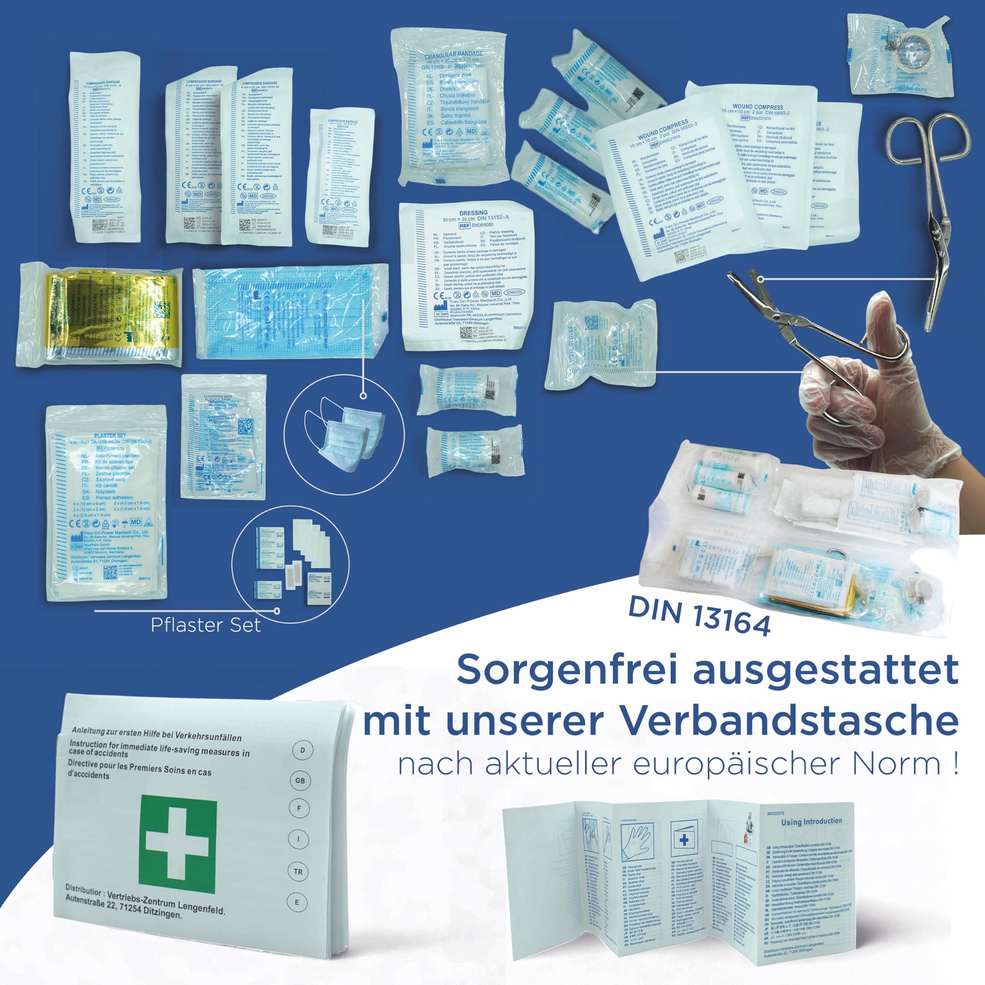 "Avoid fines: A car first aid kit 2025 is mandatory in the EU. With our first aid kit, you have everything you need and are always on the safe side. Car first aid kit 2025 TÜV tested"]