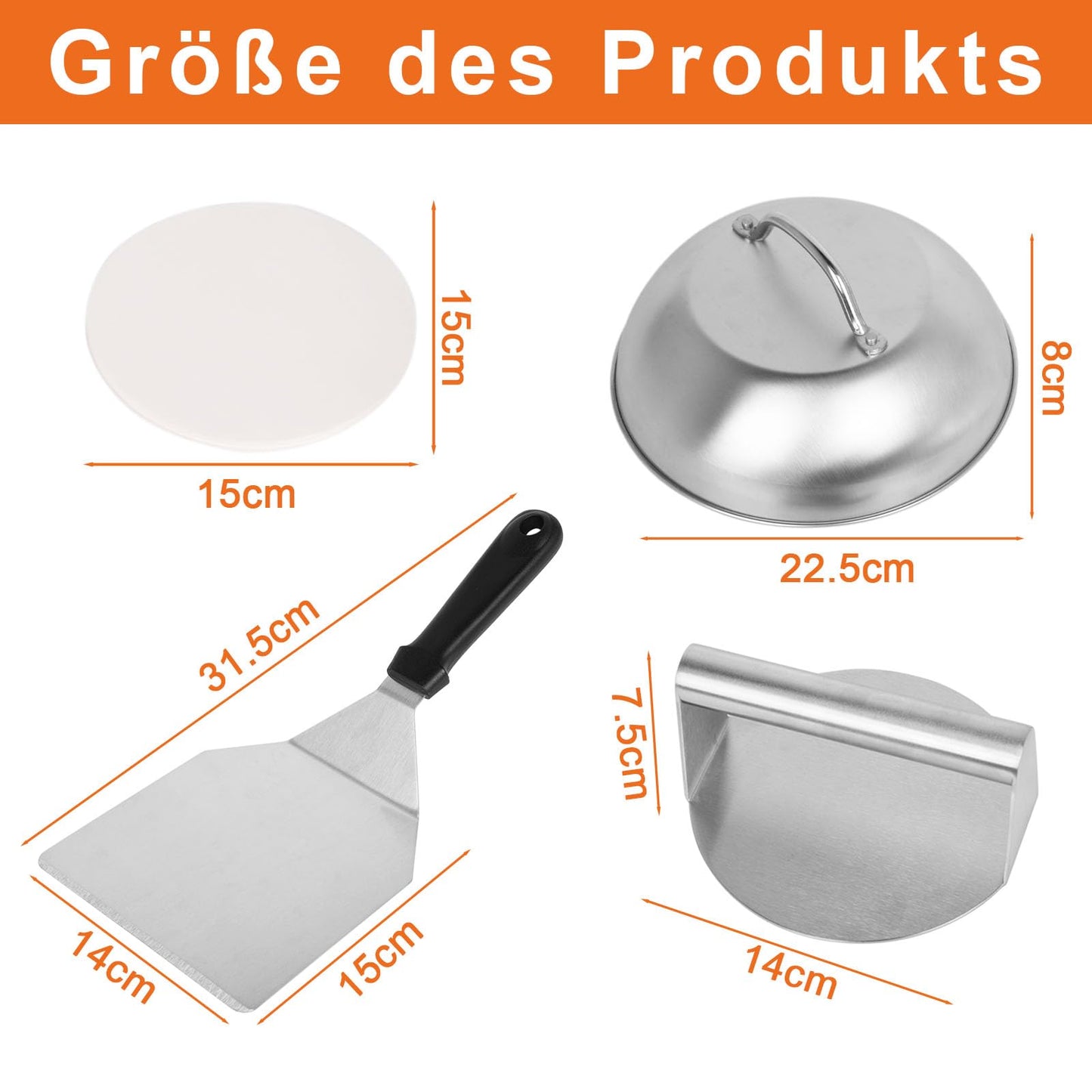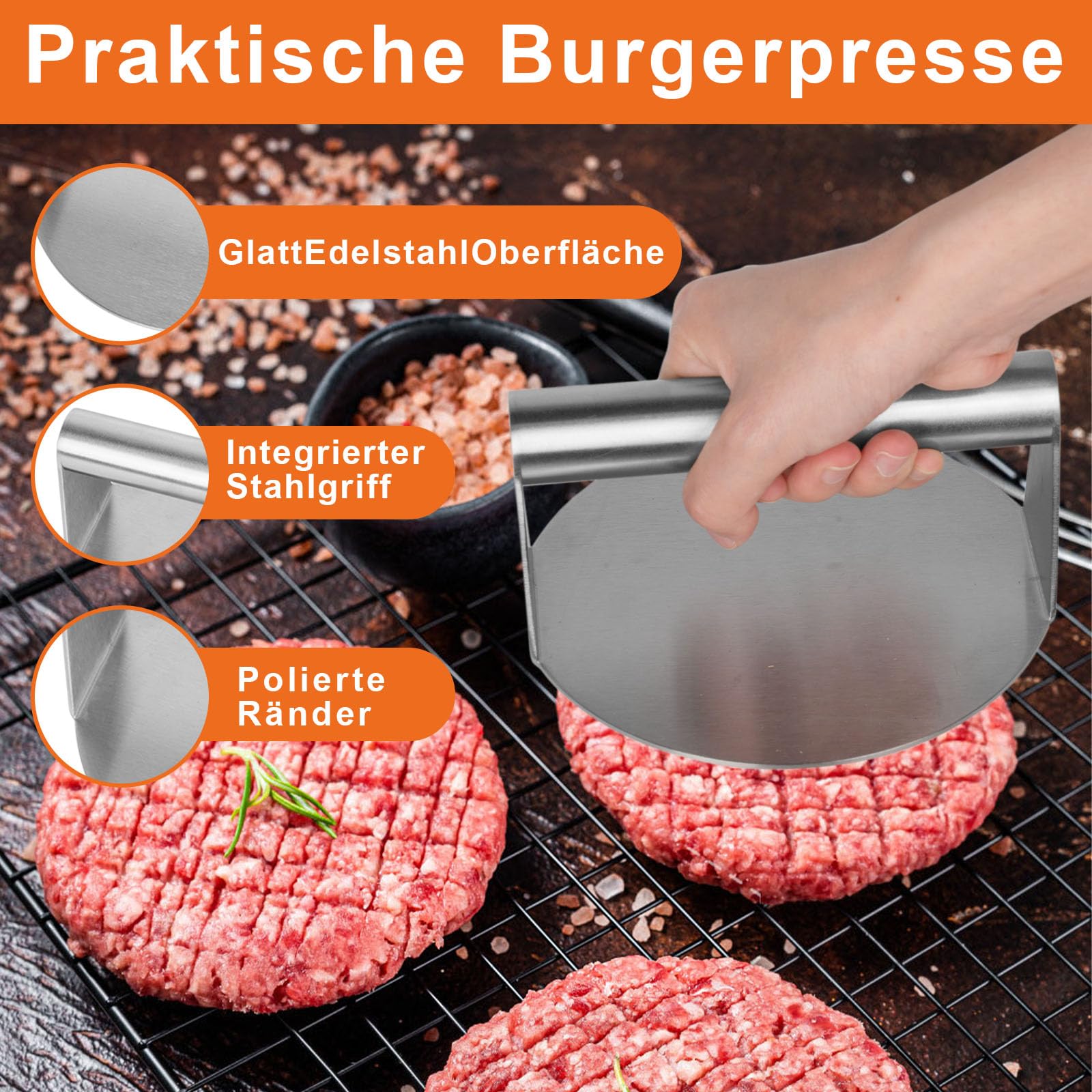 ["High Quality"] The Smash Burger Press Set is made entirely of food-grade stainless steel, which is rust resistant and durable. The integrated welding technology keeps it stable for a long time and prevents it from coming loose easily. It is non-stick and easy to clean.