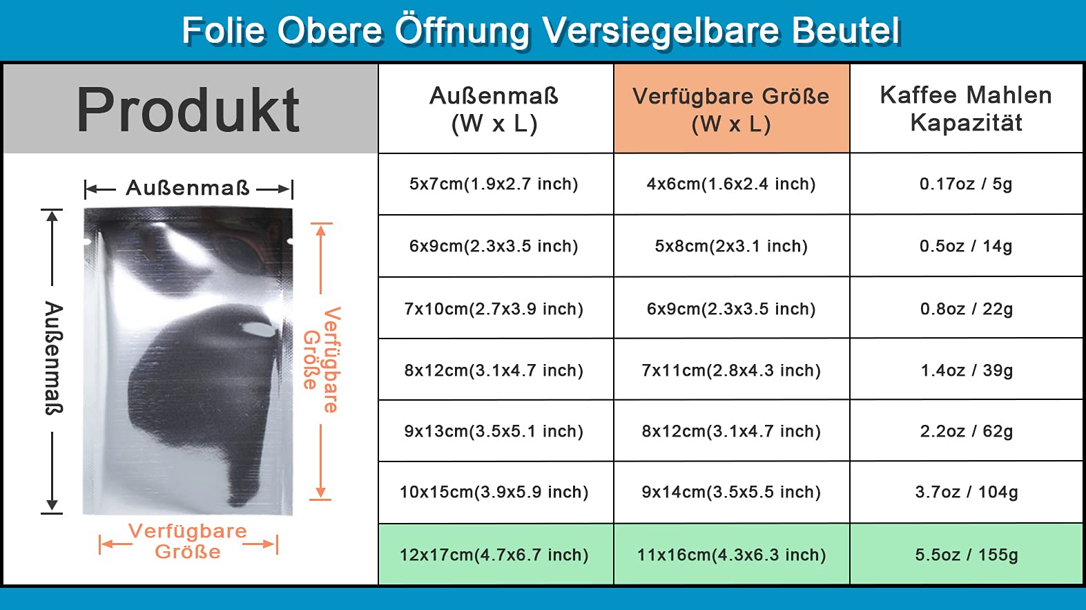 ["Size: 12x17cm (4.7x6.7 inch); Sold in a pack of 200 pieces; Thickness: 0.09 mm / single layer.","The open filling bag can be vacuum sealed or heat sealed at the top","Open top, can be heat sealed and vacuum sealed (Note: any vacuum sealing can only vacuum the embossed bags, Please note that your vacuum sealer can handle our glossy bags before placing an order, Thanks!)","Material: Aluminum foil; Color: Silver","Perfect for packaging food, coffee, beans, nuts, candies, cookies, etc."]