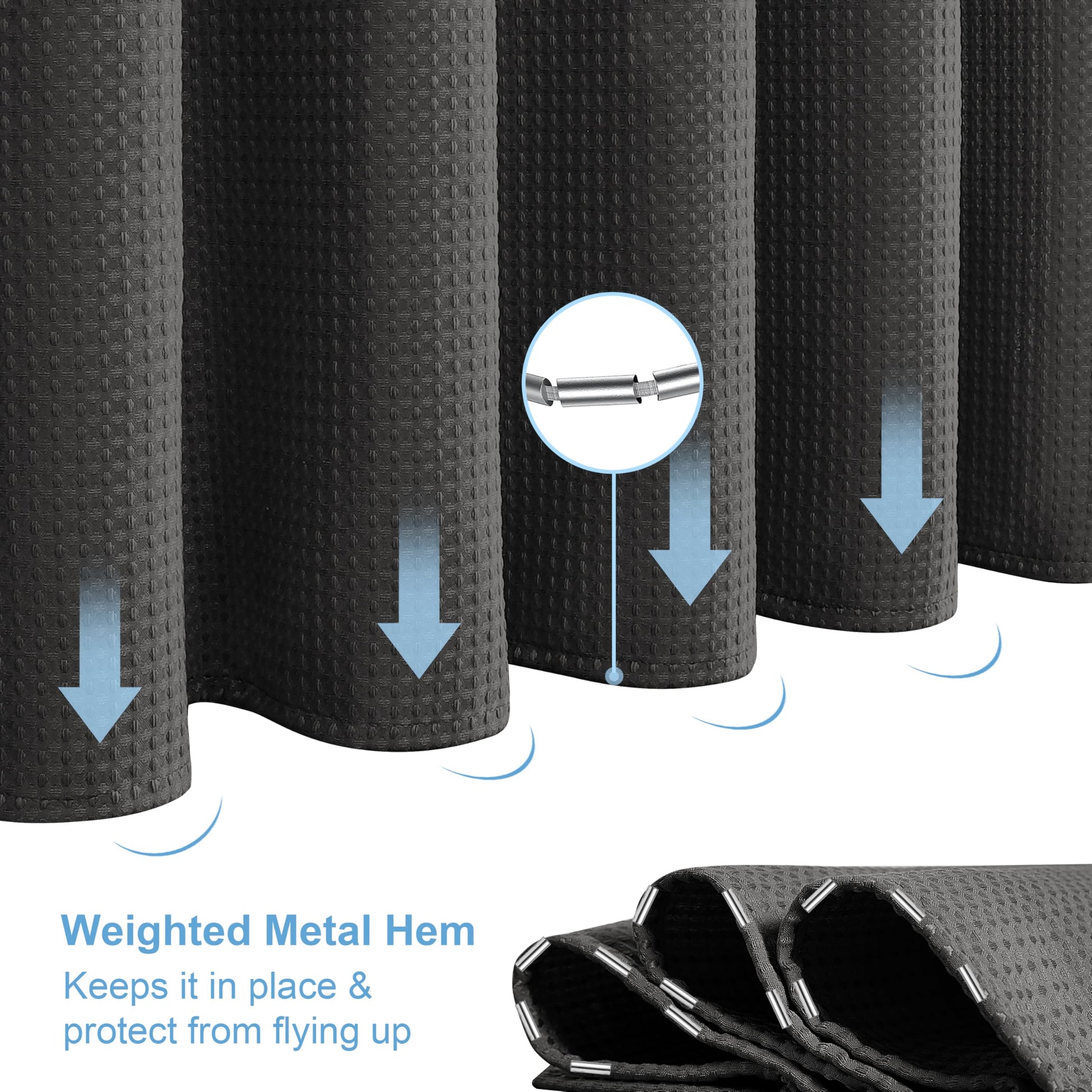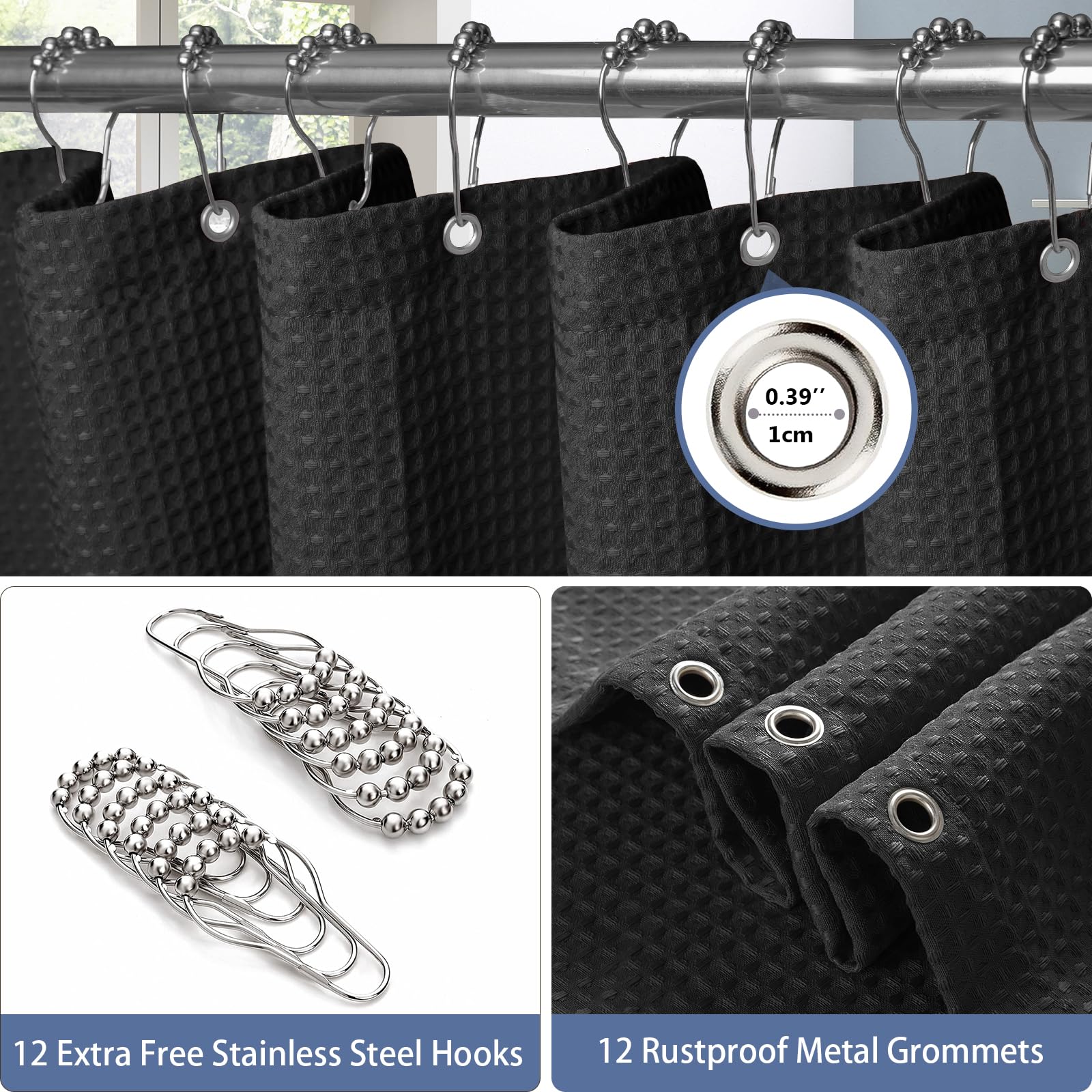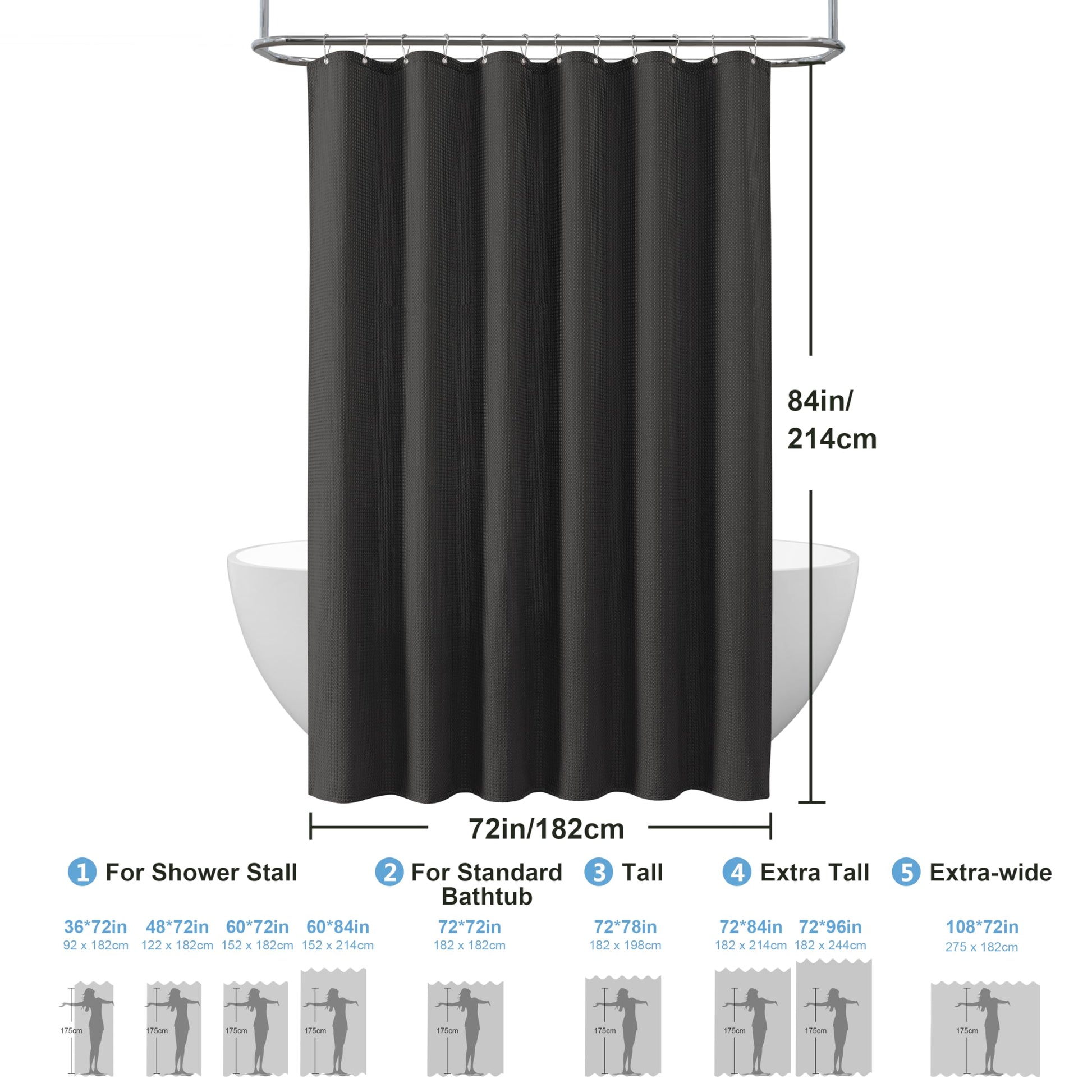 Waffle shower curtain with metal shower curtain rings fabric textile bathtub curtain anti mold bath curtain set waterproof bath curtain heavy shower curtain bathroom - 182 x 214cm (black)