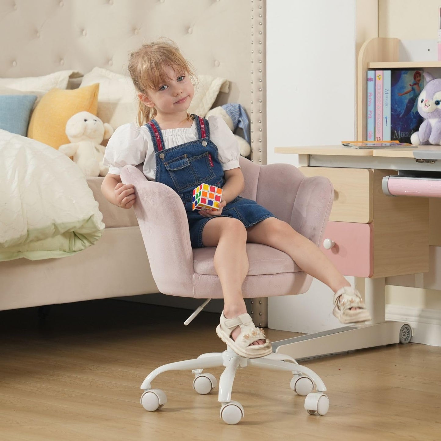 ["Sweet Shape: The petal backrest and quilted design make this chair like a flower; armrests can provide the child with the ultimate seating comfort and safety experience.","Adjustable Height: Seat cushion height adjustable in (40-48 cm), pneumatic one-touch height adjustment, perfect for desks of different heights.","Unique Design: The seat can rotate 360 degrees. There are five multidirectional wheels on the bottom to ensure smooth and quiet movement in all directions.","Multiple Uses: The bright color and cute shape of this chair bring more vitality to the children's room. Whether children are playing, reading, learning, etc., the Wahson chair provides them with a comfortable seat.","Easy to Assemble: Simple assembly required. The instruction manual is packaged in a box. Please contact us with any questions about the chair."]