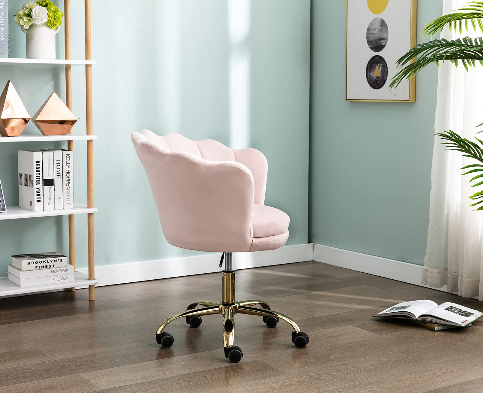 Wahson velvet swivel chair, height-adjustable, armless, with gold base, desk chair for bedroom/vanity, light pink, velvet.