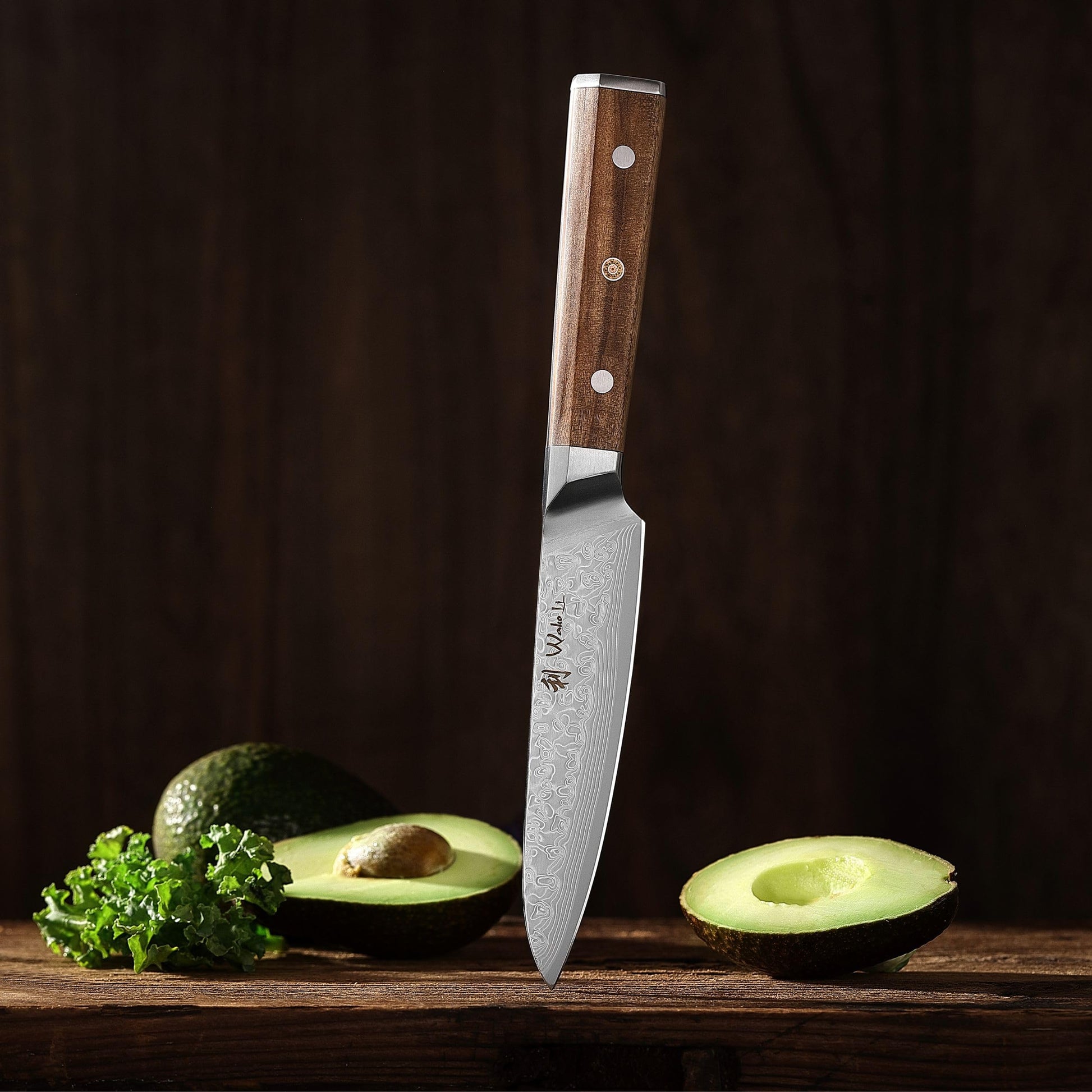 ["VERSATILE DAMASCUS KNIFE - Utility knife with 5-inch blade, 9.6-inch total length, and 4.8 oz weight - ideal as an office knife, paring knife, or small vegetable knife for precise cutting of vegetables, fruits, meat, and fish","SHARP KNIFE THANKS TO VG-10 CORE - 67 layers of Damascus steel with a durable VG-10 core, hardness 60 ± 2 HRC, V-shaped edge with approximately 15° on each side - long-lasting sharpness, precise cutting, and high resistance for daily kitchen use","FULL TANG CONSTRUCTION: Full tang for maximum stability, safety, and balance - supports fatigue-free work and makes the knife durable, long-lasting, and reliable for everyday use and professional use","ERGONOMIC OLIVE WOOD HANDLE: Handle made of olive wood with natural grain and secure grip - ergonomically shaped, non-slip, and balanced, suitable for comfortable cutting for both right and left-handed users","GIFT BOX AS A PRESENT: Delivered in a high-quality gift box, suitable as a gift for birthdays, anniversaries, housewarmings, or holidays - a classy Damascus knife for those who appreciate fine kitchen knives"]