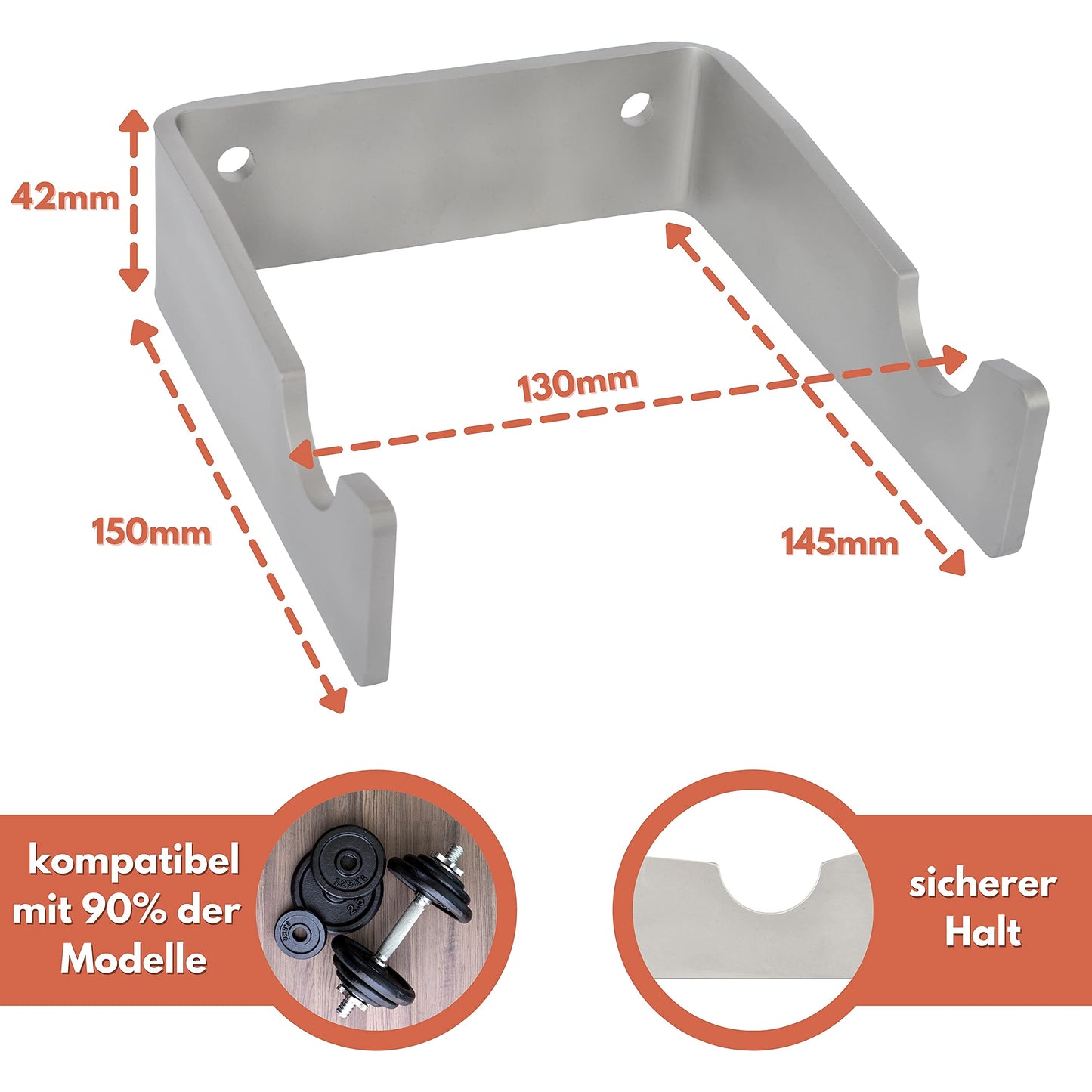 "Compatible: If the distance between the inner weight plates is at least 13 cm, your dumbbell fits on the wall mount. This is the case with over 90% of all available dumbbells."]