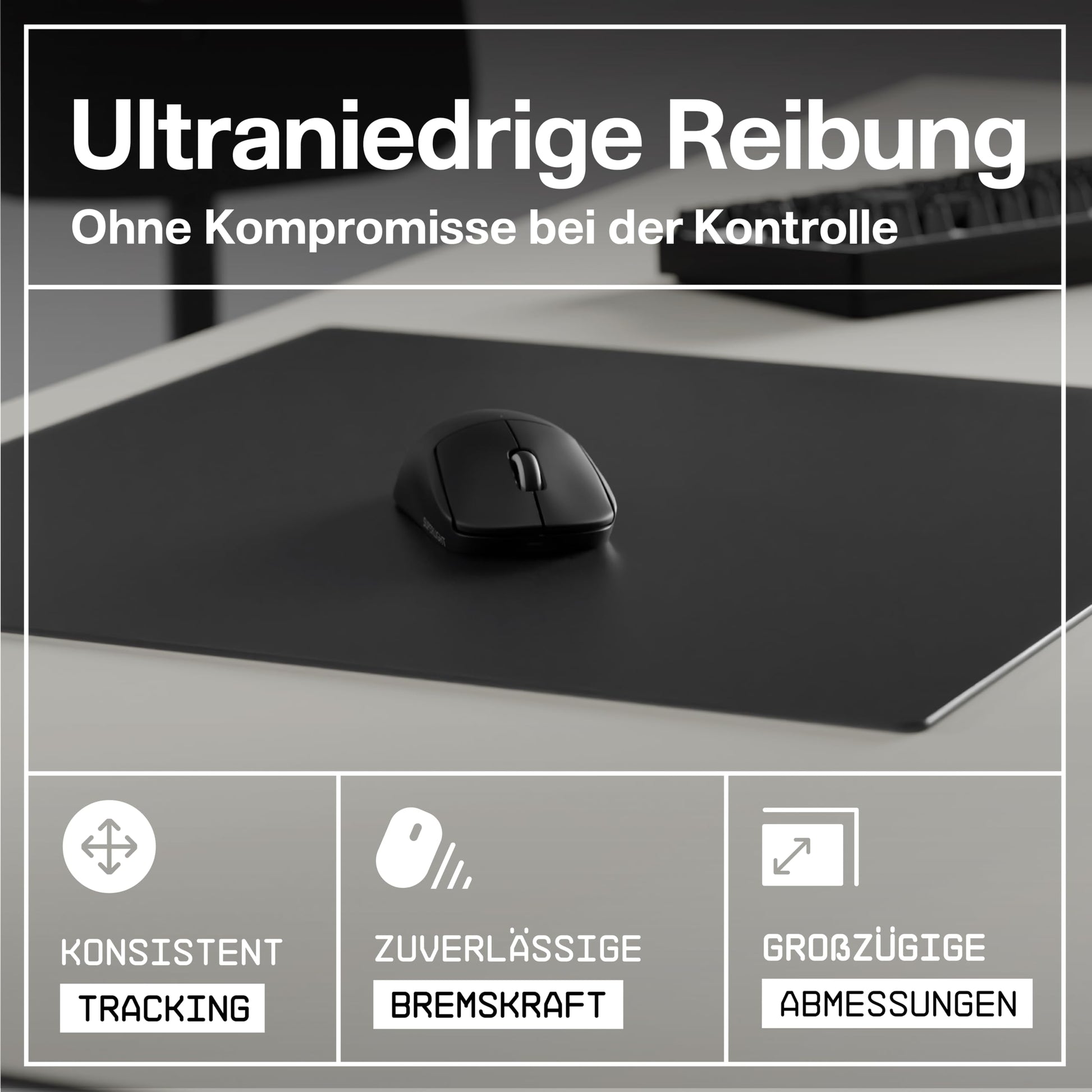 "A NEW TARGET EXPERIENCE: The uncoated, micro-etched surface provides extremely low friction with high stopping power for an unparalleled synergy between fast and controlled movements. A unique experience that only a glass pad can offer.",