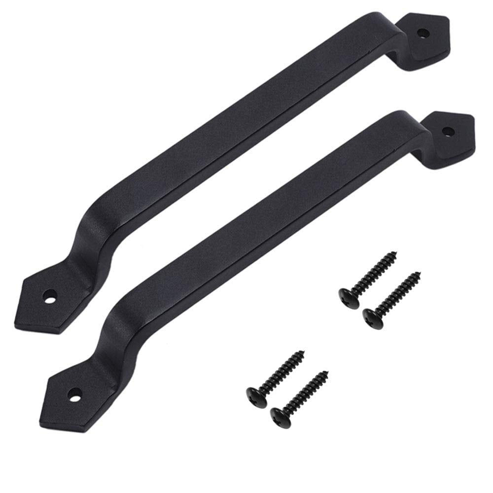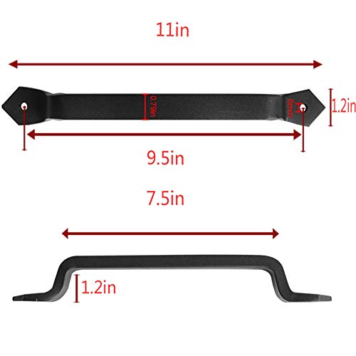 ["Size: Overall size: 11'' L * 3/4'' W. Hole to hole center: 9 1/2 inches. Total height from mounting surface to top of handle: 1 7/16 inches.","Versatile - This black barn door handle made of high-quality steel can be used for doors, garages, barns, sheds, cabinets, and sliding doors indoors and outdoors. It has been designed as a luxurious high-end fixture for interior decoration of homes, emphasizing the rustic charm of your large barn doors, gates, cabins, or garages.","High Quality - This handle is made of high-quality carbon steel and is very sturdy on any door. Can be used as an internal or external barn door handle, sliding door handle, door or garage door handle, cabinet door handle, etc. It is made of high-quality steel with a black powder coating and comes with two matching screws."]