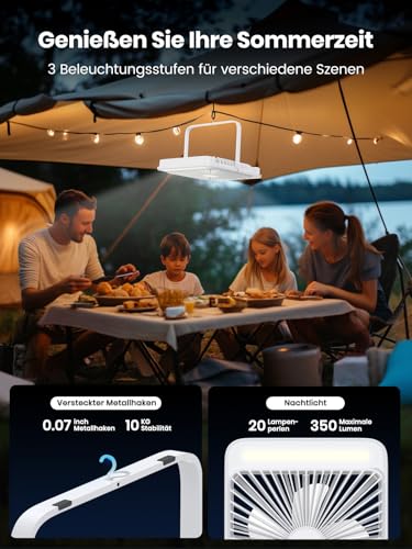 ["Powerful and efficient cooling performance: Equipped with a high-capacity 20000 mAh battery, stay cool all day long with up to 15-48 hours of continuous operation on a single full charge. The 4 speed settings and 5-blade design provide powerful yet whisper-quiet cooling, making it perfect for offices, home, and outdoor adventures","Compact and portable design with foldable stand: With only 4.5 cm thickness and weighing just 0.77 kg. Equipped with a foldable stand, the fan can be easily positioned and adjusted to direct airflow where you need it most. Fits easily in backpacks, tents, and other tight spaces. The space-saving design eliminates the bulkiness of traditional camping fans, allowing you to enjoy cool comfort without the hassle","Integrated LED lighting: The camping fan comes with a built-in LED light that is perfect for illuminating your tent or campsite. Designed specifically for camping and outdoor cooking enthusiasts, this camping fan features an integrated hook for easy hanging. Simply hang it overhead to enjoy both cool airflow and bright light, providing comfort and convenience during your outdoor adventures","Whisper-quiet performance: The rechargeable table fan features a large 20 cm size and durable blades that provide powerful airflow for ultimate comfort. With noise levels kept under 45 dB, thanks to its efficient brushless motor, this fan is perfect for creating a peaceful atmosphere both during outdoor camping and in the bedroom","Smart features: This table fan includes an LED display that shows the battery status and speed settings, allowing you to effectively manage energy"]