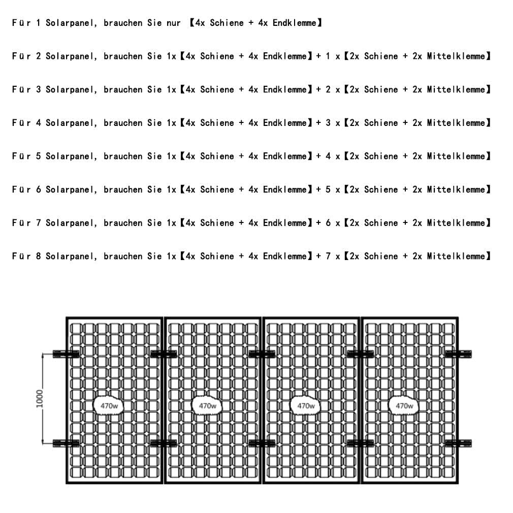 ["High-strength aluminum alloy: The solar module mounting bracket is made of high-quality AL6005-T5 aluminum alloy, which has excellent corrosion resistance and durability and can withstand various harsh weather conditions and environments.","Improved solar mounting: The end clamp has an improved adjustable function, which is compatible not only with 30 mm thick solar modules, but also with 35 mm thick solar modules.","Professional design: It has excellent stability and reliability, which can ensure the safety and stability of solar panels. In addition, the aluminum alloy material also has excellent thermal conductivity, effectively reducing the temperature of the battery panel and improving the efficiency of solar energy conversion.","Easy installation: The aluminum profiles are screwed to the substrate and the PV modules are mounted on them with the module clamps. Suitable for sheet metal roofs, flat roofs, trapezoidal roofs.","Scope of delivery and dimensions: 10x aluminum profile each 230x55x60 mm (LxWxH), 4x adjustable end clamps 30-35mm, 6x middle clamps 35mm. If you need to install additional panels, please contact us and we will provide you with a solution." ]