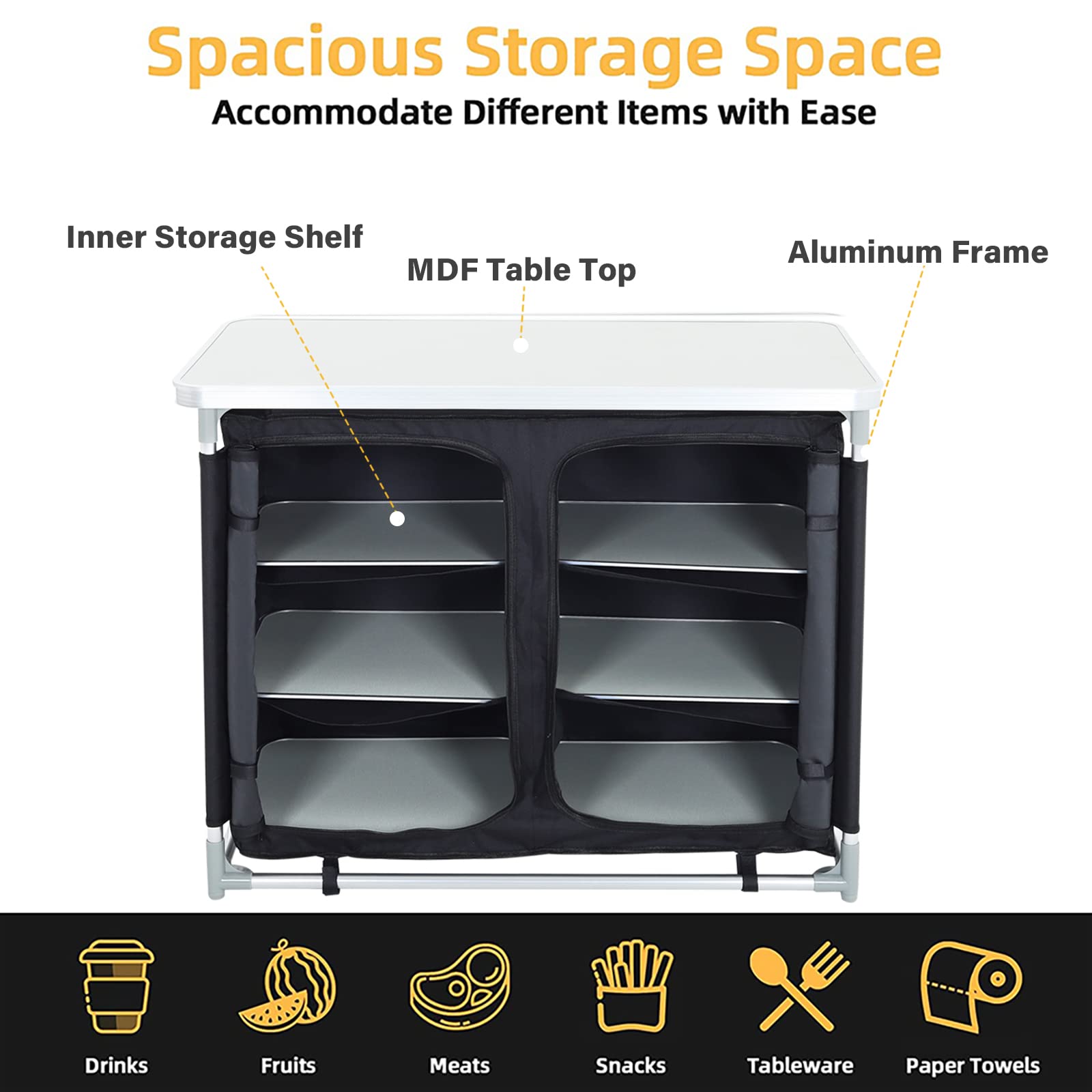 ✨【6 Compartments & 1 Worktop】The camping kitchen cabinet has 6 storage compartments, ideal for storing food and other items. It offers plenty of space and has a worktop that provides additional space for meal preparation.
