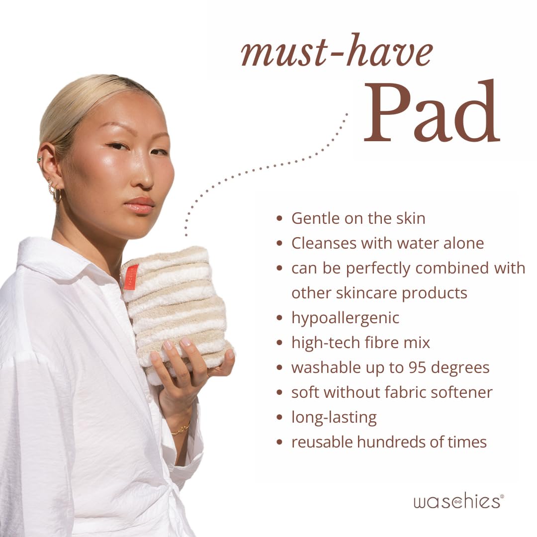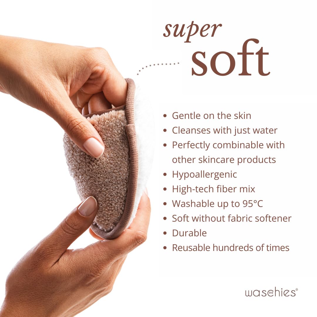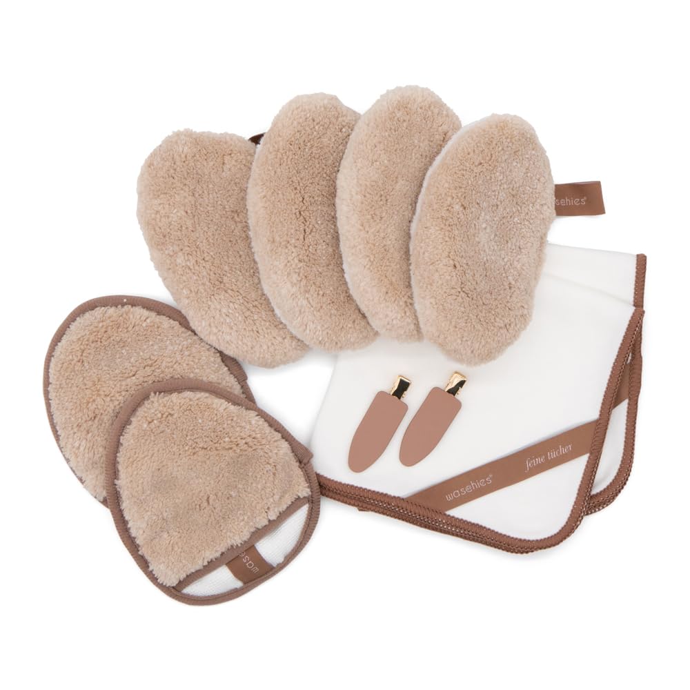 ["Complete beauty set: Includes 4 washies makeup remover pads, 2 eye pads, 2 face towels, and 2 hair clips - everything for your daily cleansing routine","Sustainable alternative: Reusable pads made of specially thick microfiber coated with viscose - reduces the consumption of disposable products like cotton pads and cosmetic tissues.","Gentle on the skin & effective: The special fiber mix thoroughly removes makeup, dirt, and cream residues without irritating the skin - ideal for sensitive skin","Perfect finishing touch for your facial cleansing: The soft face towels ensure gentle drying and prevent the transfer of bacteria","Practical accessories: The included hair clips keep your hair away from your face and prevent marks - perfect for daily care."]