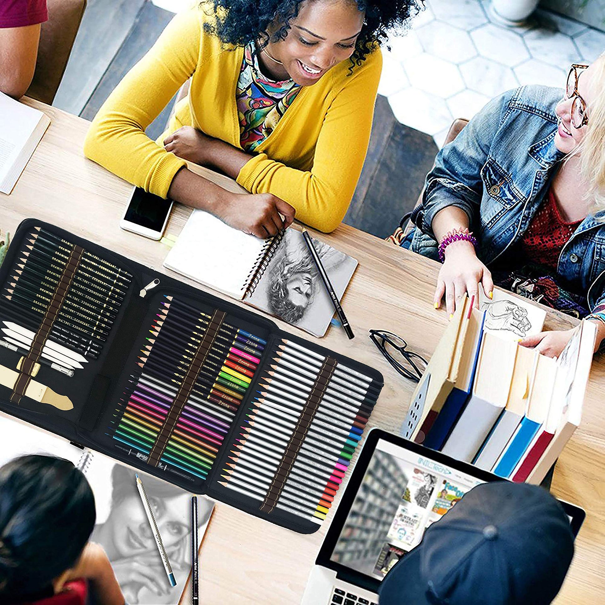 ["BEGINNER & PROFESSIONAL - A truly versatile art set for kids and adults. This organized art set is great for students working on craft or art paper, or coloring adult coloring books at home.","TRAVEL-FRIENDLY STORAGE - The portable kit bag can keep your pencils neatly stored and preserved.","PERSONALIZED HOLIDAY GIFT - Our best-selling 70-piece art pencil set makes a wonderful Christmas, birthday, or New Year's gift for those who love to be creative in the art world.","Safe and non-toxic - 100% original wood pencils. Made from environmentally friendly material that is safe for your health. Colored pencils with rich and bright colors, gently written with inspiration, uniform in color, not easy to fade, and high-quality sticks for artists of all levels.","BIGGER, BETTER, COMPLETE - This professional art pencil set comes complete with 73 pieces, including pencil case, 24 coloring pencils, 12 metallic coloring pencils, 12 watercolor pencils, 3 charcoal pencils, 12 drawing pencils, eraser, box cutter, hookline pen, frosted board, adult coloring books, dual head pencil extender, and 3 paper blending stumps."]