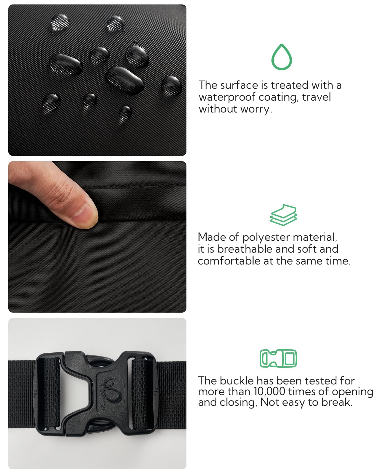 ["5 TYPES OF COMPARTMENTS: Large main compartment with internal security pocket with zipper. The bum bag has an anti-theft cell phone pocket on the back. There is also a key pocket and a front pocket. Keep all your things organized","ADJUSTABLE HIP BELT: Suitable waist circumference: 20-53 inches. The adjustable strap allows the bum bag to be worn comfortably as a belt bag, shoulder bag or crossbody bag. The wide strap improves comfort when worn for long periods of time","WATER-RESISTANT FABRIC: The surface of this waist bag is made of water-repellent fabric. Even in bad weather, it will protect your phone, passport and valuables. Do not wear it for a long time in heavy rain, as this breathable material is not completely waterproof","PRACTICAL DESIGN: The bag body adopts a boat-shaped design, which fits the body better and prevents the waist bag from shifting or shaking. The waist bag has an SBS zipper that is not easy to break and can open and close smoothly","VERSATILE APPLICATION: This belt bag has a classic square design. It offers plenty of storage space and weighs only 8.5 ounces. Therefore, it is suitable for many activities such as daily commute, festivals, dog walking, traveling, mountaineering, hiking, camping and cycling, etc."]
