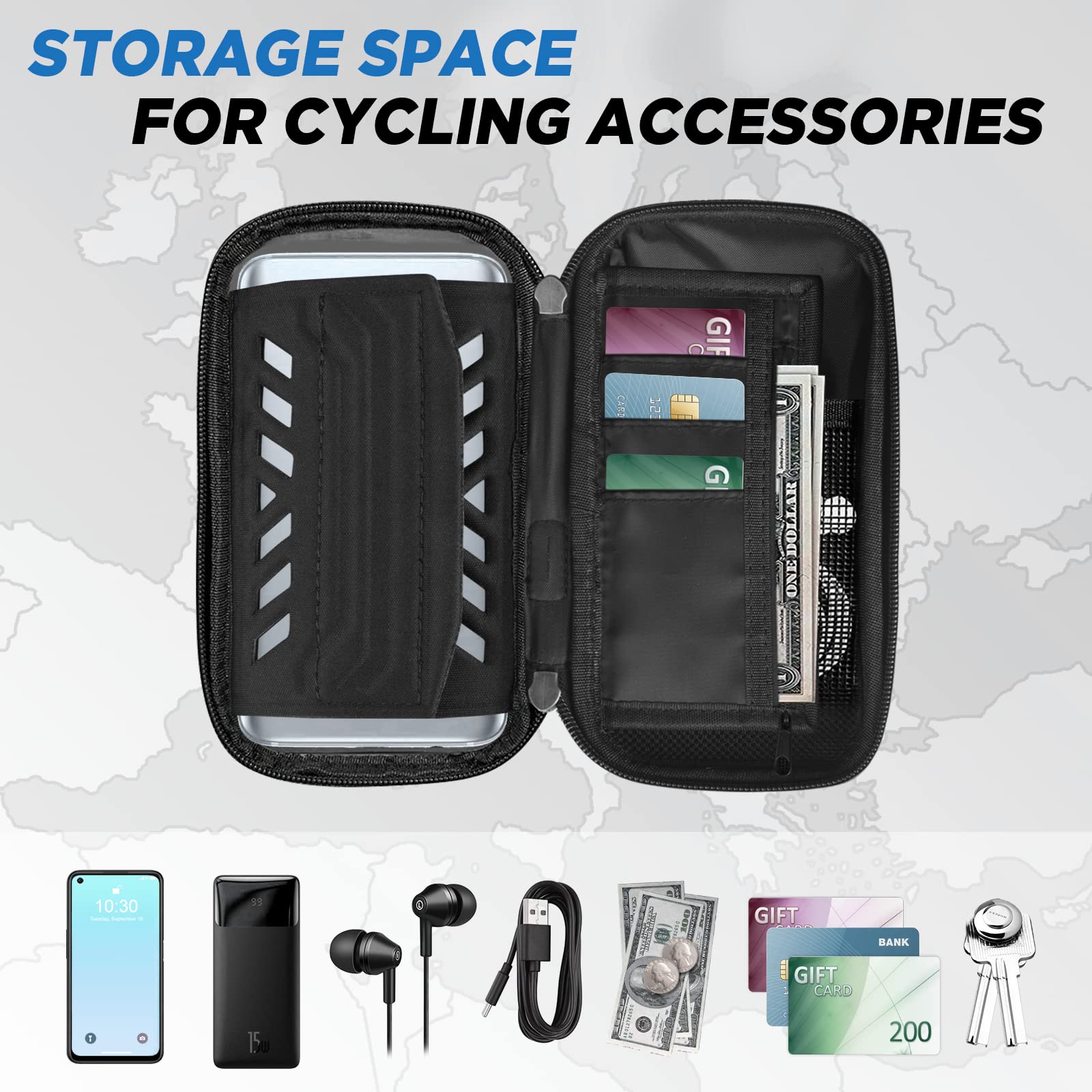 "Water-Resistant Phone Holder with Rain Cover: The bike phone mount is made of wear-resistant, durable, high-quality EVA and a well-sealed double zipper, ensuring that no water enters the bag. It can protect your phone and items in the bag from dust, dirt, and sand. You can use the included rain cover during rainy days to better protect your belongings",