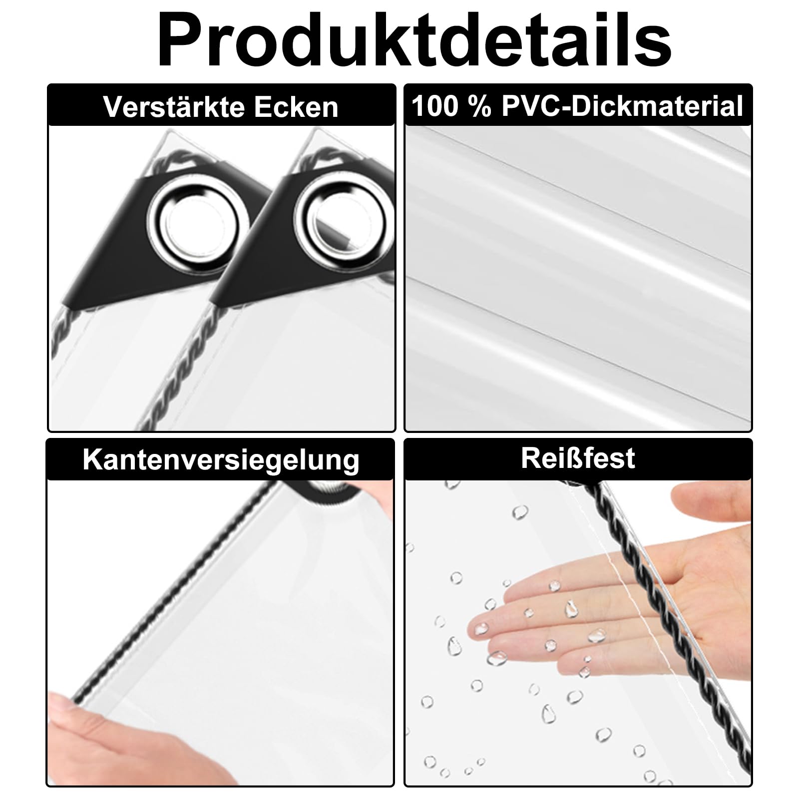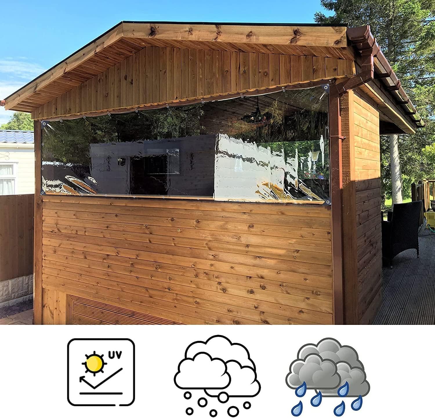 "Size and Material: Tarpaulin is 0.3 mm thick, the eyelet diameter is 1.6 cm and the spacing is 50 cm, 420g/m² heavy-duty, boat tarp made of high-quality PVC material, High transparency, durable.