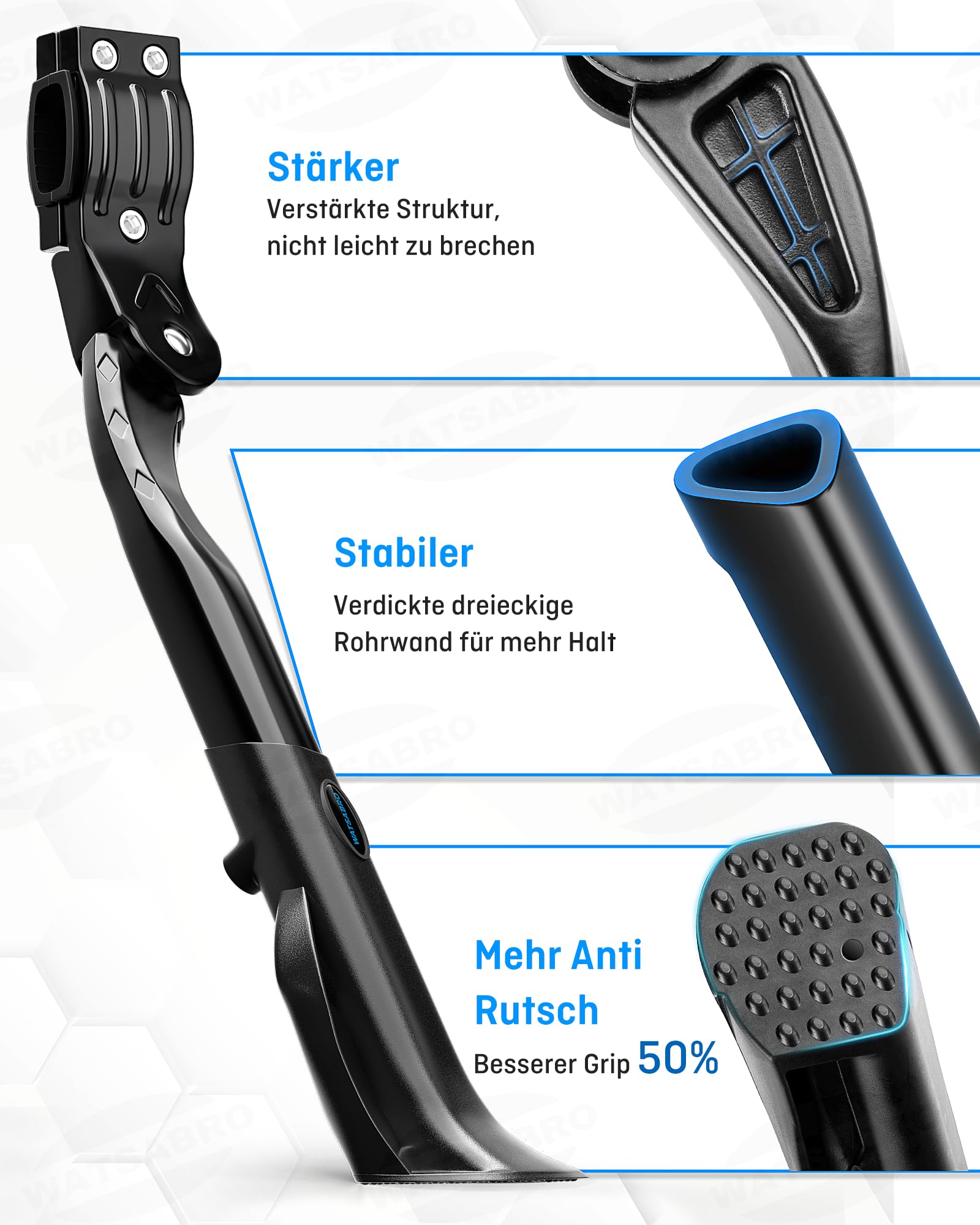 "【STRONGER】With integrated structural improvements and triangular aluminum tubes, this side stand for bicycles has additional reinforcements and a thickened stand tube wall to provide more stability than a regular bike stand. Ideal for E-bikes and mountain bikes - it won't break, even when used off-road!",