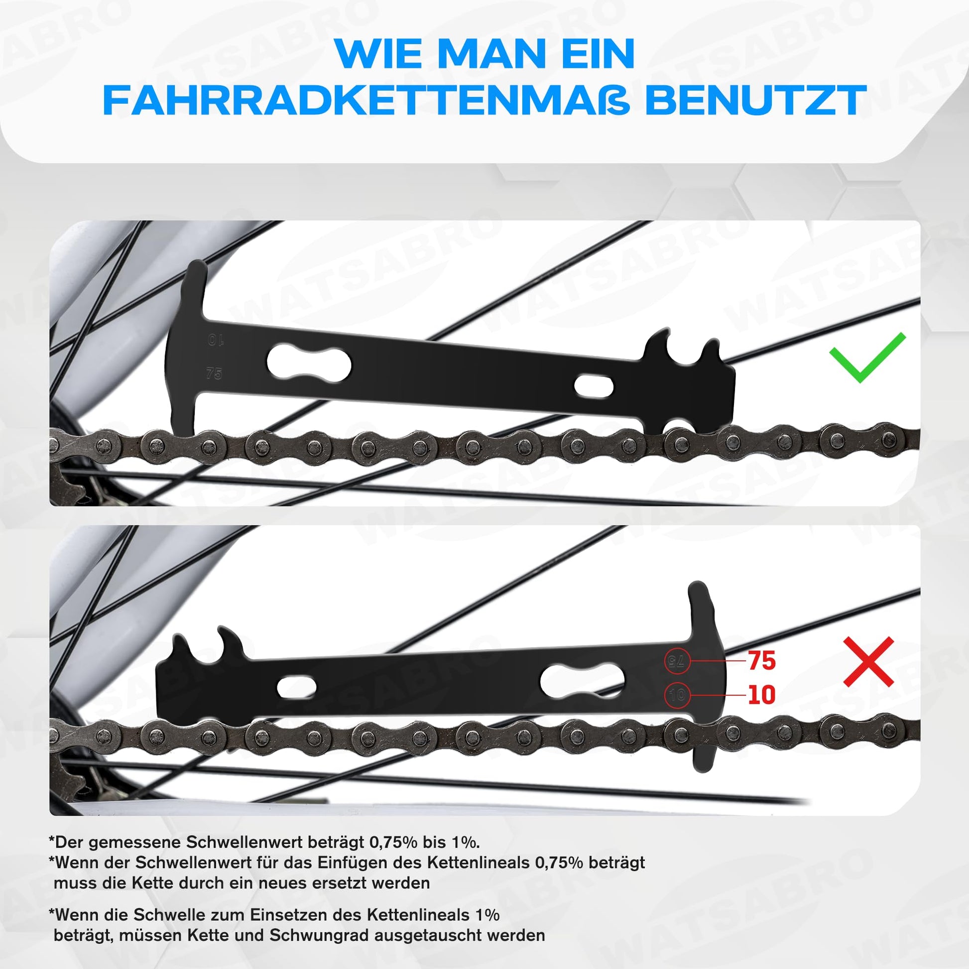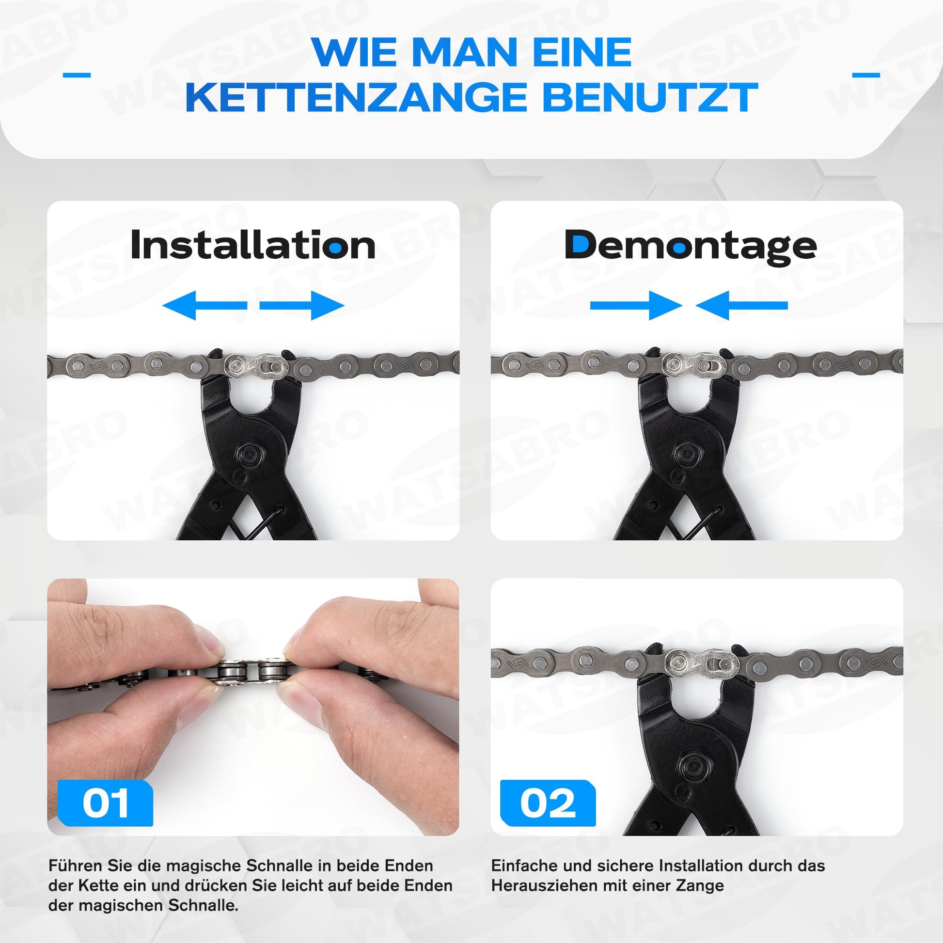 ["Bike Chain Tool Set for Bicycles A kit with bike chain tools for bike chain repair. Including chain gauge, bike chain tool, and bike chain pliers, chain lock pliers","Premiere hardening technology - Upgrade We have further developed the bike chain tool by using high-quality carbon steel material and applying a hardening technique that increases the overall hardness and precision of the bike chain tool. The bike chain tool has become larger and thicker overall and features more ergonomic handles that provide a more comfortable grip. It is more resistant to wear and tear, taking your bike repairs to a new level","Advanced Bike Chain Tool The bike chain repair set is suitable for repairing 6, 7, 8, 9, 10, 11, and 12-speed chain connections. The complete bike repair tool set is perfect for any inconveniences on your travels. Made of high-quality steel, high strength and durability, suitable for various household bikes","Easy to Use The bike chain tool is extremely user-friendly. The chain pliers and chain cutter allow for effortless assembly and disassembly of the chain. The bike chain pliers handle is coated with rubber to be non-slip, not to harm your hands, reduce effort, and ensure a comfortable grip. Equipped with a bike chain gauge to measure whether your chain needs repair","Professional and reliable Our bike chain rivet tool and bike chain pliers are made of high-quality steel, which has high hardness and precision. You don't have to worry about the accuracy of the tools or about deformations and breakages during bike repairs","Various Uses: Suitable for city bikes, touring bikes, racing bikes, city bikes, mountain bikes, and racing bikes. Feel free to add it to your cart if you need it! WATSABRO accompanies you on your journey"]