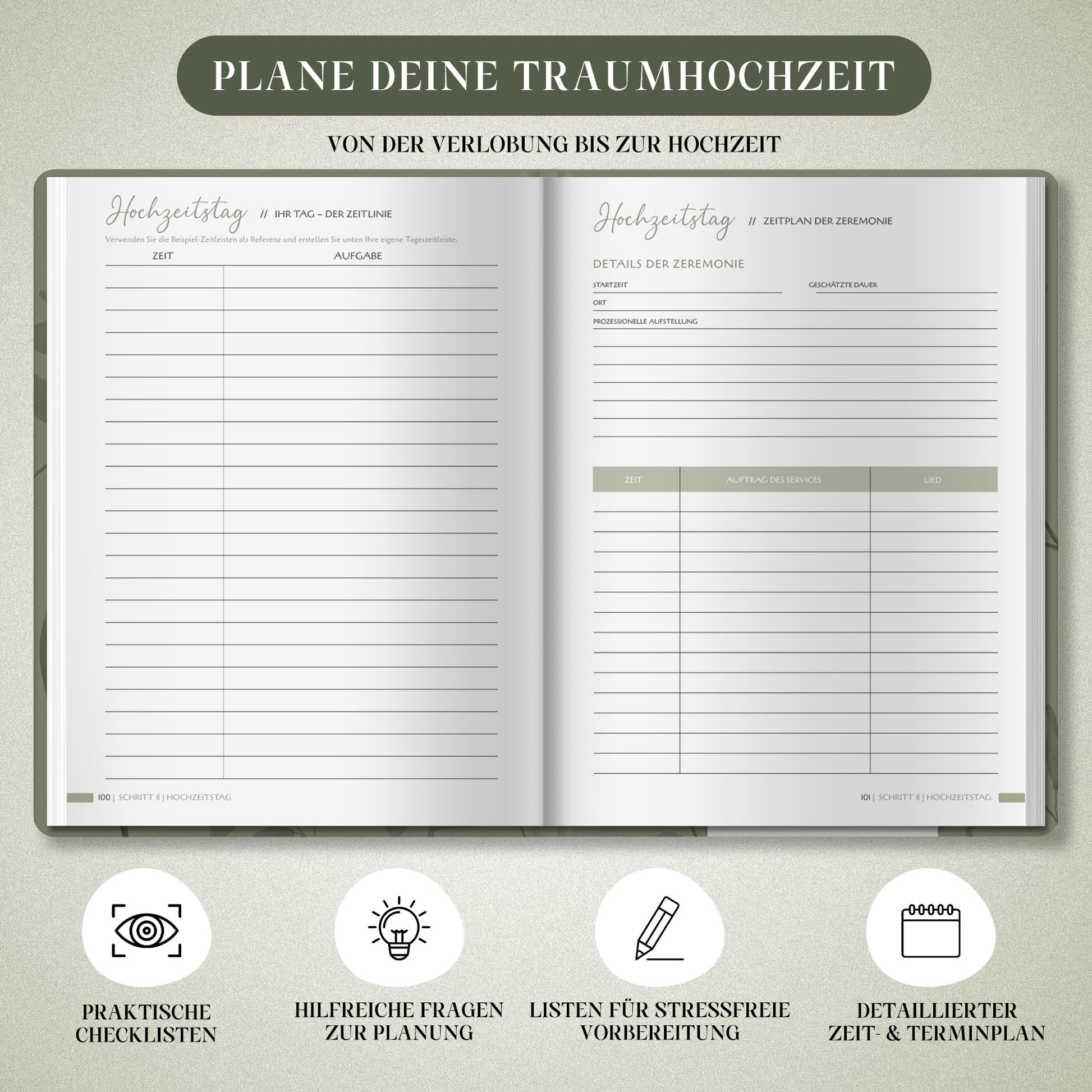 Wedding planner in German A4 | 180° lay-flat design | 160 pages with schedule, checklists, tips, and calendar | Perfect engagement gift for couples.