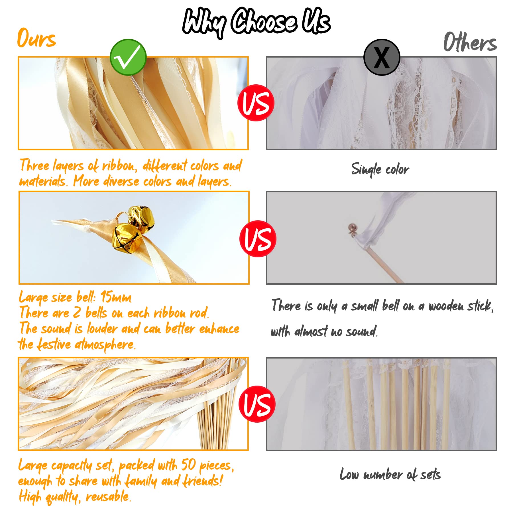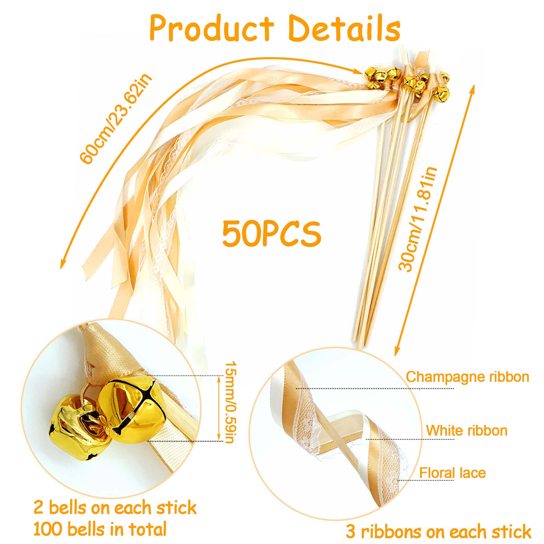 ["100 large bells"]: Each stick has 2 large bells (15 mm/0.59 inches), for a total of 100 bells. Our bells are very large and produce a bigger, clearer, more ethereal, and atmospheric sound. When the bride and groom take the stage and dance with the ribbon, the beautiful golden bells ring out, creating a festive atmosphere at the party or wedding, making your wedding an unforgettable experience for life!