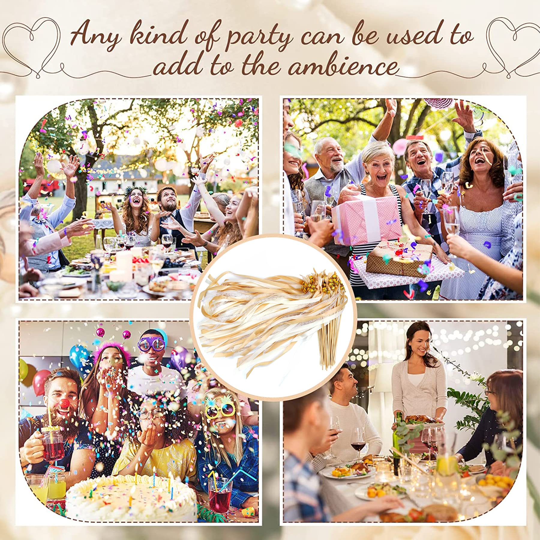 ["Wide range of uses"]: These wedding ribbon sticks are ideal for wedding parties, holiday celebrations, intimate interactions, student games, class events, performances, receptions, parties, birthdays, baby showers, Christmas, New Year's celebrations, and more. The sweet sound and fluttering ribbons will give you unforgettable memories.