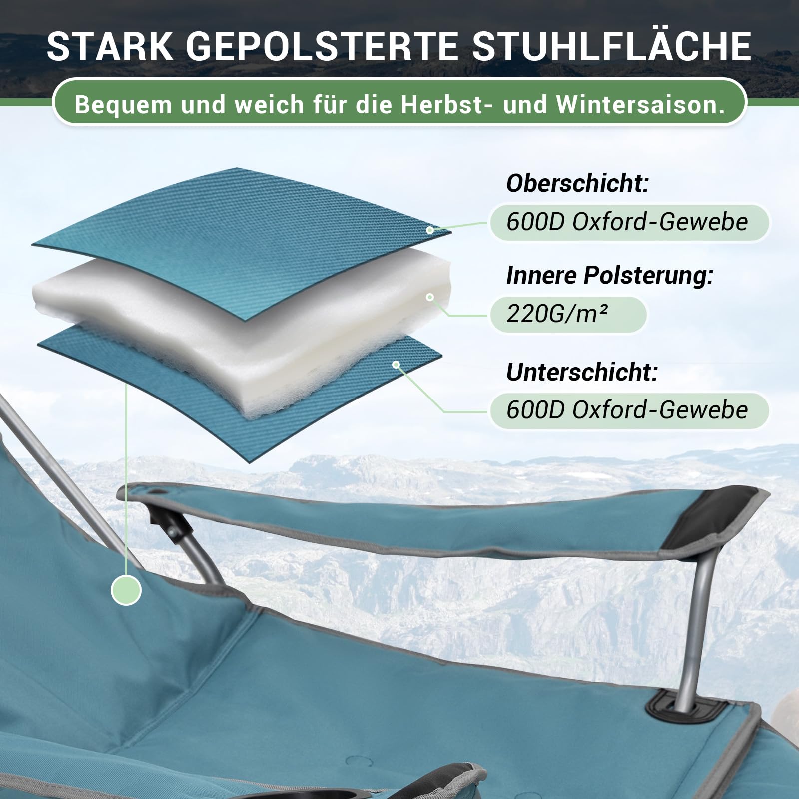 ["High Quality"] The camping chair is made of durable Q195 steel tube with spray treatment and a cross-triangle design, ensuring high strength and corrosion resistance. Whether in damp weather or under heavy load, this camping chair always stays in perfect condition. The durable mesh fabric offers additional comfort and a luxurious feel. With a weight capacity of up to 300 lbs, it provides long-lasting reliability and quality even with intensive use.