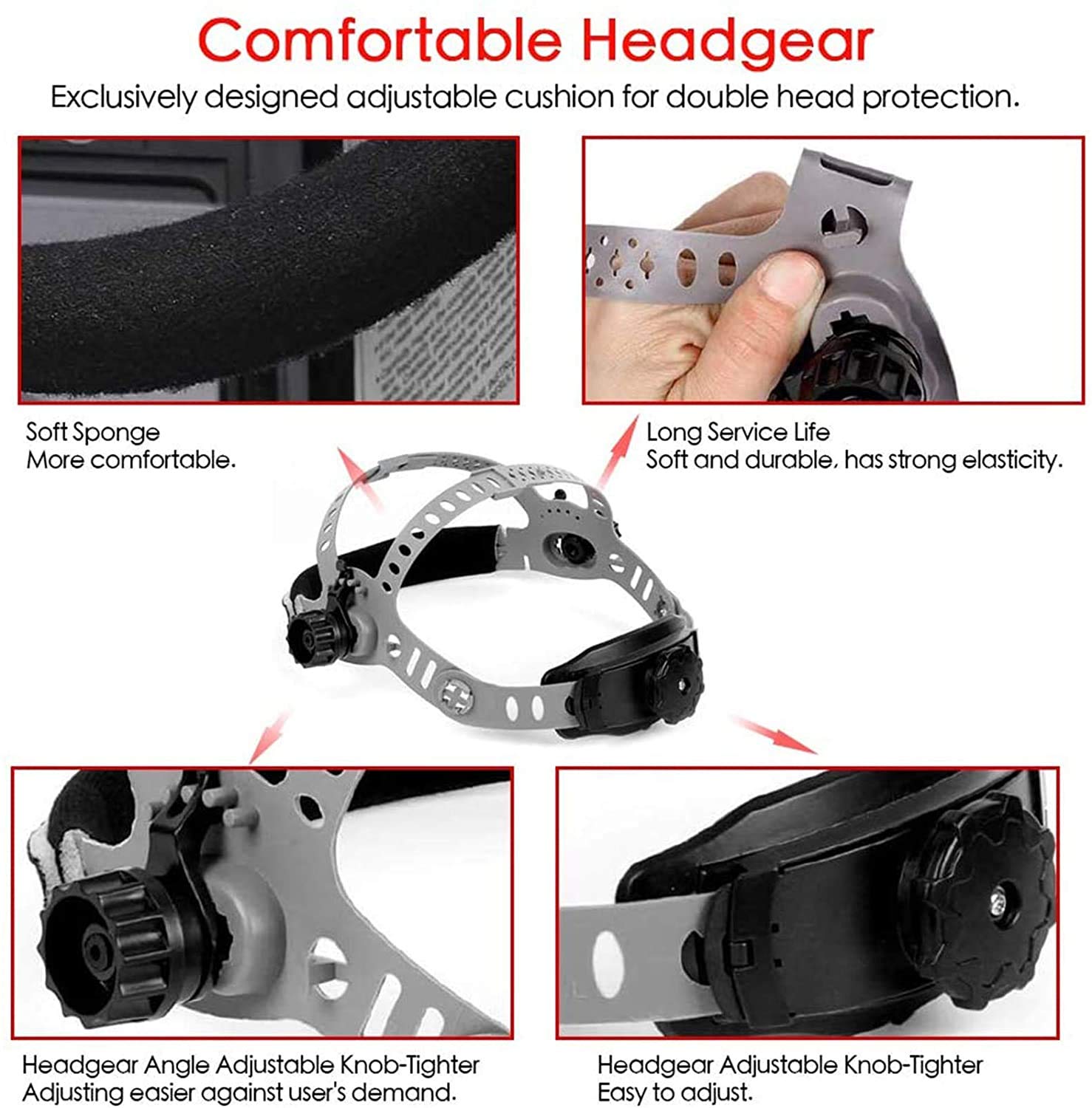 "Ultimate eye protection: Automatic darkening filter switches from light to dark in 1/10000 seconds, protecting the welder from UV and IR radiation in case of power failure. Balanced with an adjustable and fatigue-free comfortable headband. Lightweight for long work.",