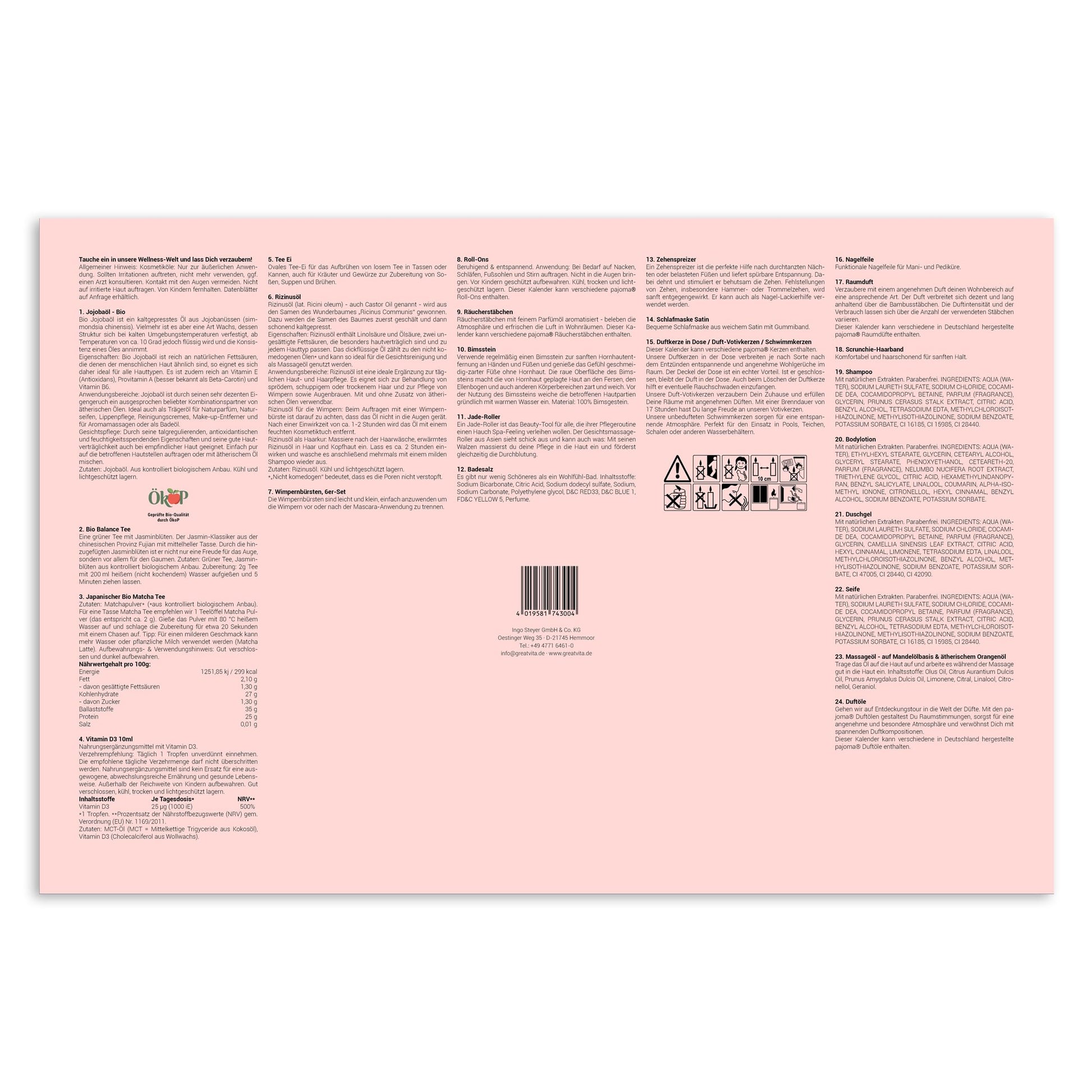 ["24 luxurious wellness surprises: Each day in December, a high-quality skincare product, a relaxing accessory, or an aromatic treat awaits – from Jojoba oil to Matcha tea to scented oils.",