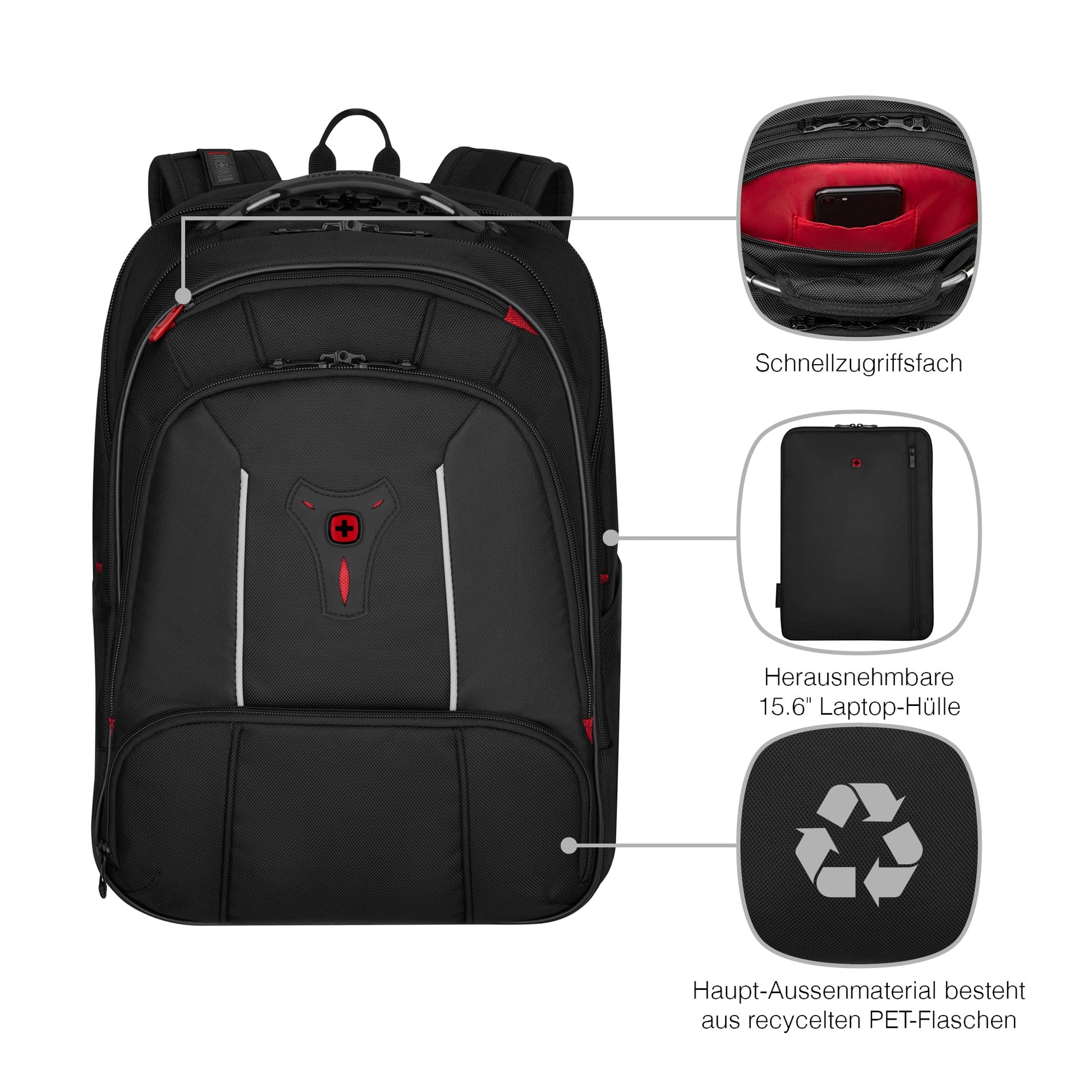 ["RECYCLED EXTERIOR MATERIAL: The modern laptop backpack, made from recycled PET bottles, not only offers style and comfort but also uses high-quality materials. A practical and innovative companion for your workday.","PRACTICAL COMPARTMENTS: In addition to a padded compartment for a 17\" notebook and a 10\" tablet, there is an organizer compartment. The backpack also includes a removable 15.6\" laptop sleeve and side pockets.","COMFORTABLE FEATURES: The backpack is equipped with adjustable padded shoulder straps and a breathable, padded back. It also has a strap for attaching to the handle of rolling suitcases.","DETAILS: Laptop backpack, dimensions: 23 x 36 x 50 cm, storage space: 33 l, weight: 1.4 kg, model: Carbon Pro, color: Black, exterior material: 100% recycled polyester, item number: 653129","HIGHEST QUALITY: WENGER is a manufacturer of watches, travel luggage, and business luggage. The Swiss company is characterized by tradition, quality, precision, and craftsmanship and has a history of over 125 years."]