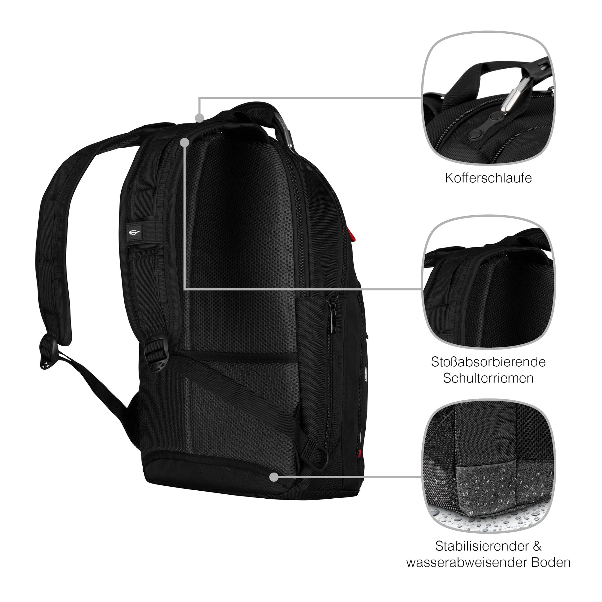 ["SIMPLE BACKPACK: This classic backpack is simple yet stylish. With its minimalist look, it is suitable for both office work and for students, school children, or travelers. It features a practical organizer compartment where you can store important accessories such as cables or chargers neatly.","WITH LAPTOP COMPARTMENT AND TABLET COMPARTMENT: In a separate padded TripleProtect compartment made of dense foam, you can easily store a MacBook Pro up to 15''. Other electronic devices such as iPads or e-readers also find space. For this purpose, a 10'' tablet compartment is provided. The integrated stabilizing platform CaseBase ensures that the backpack always has a secure stand and does not fall over.","COMFORTABLE FEATURES: The backpack is equipped with two side pockets. In addition to ComfortFit shoulder straps and a padded back for high wearing comfort, it also has a strap for attaching to the handle of suitcases.","DETAILS: Laptop backpack, dimensions: 8.3 x 13.4 x 17.7 inches, storage space: 17 liters, weight: 2.2 lbs, model: Gigabyte, color: Black, item number: 600627","HIGHEST QUALITY: WENGER is a manufacturer of watches, travel luggage, and business luggage. The Swiss company is characterized by tradition, quality, precision, and craftsmanship and can already look back on a history of over 125 years."]