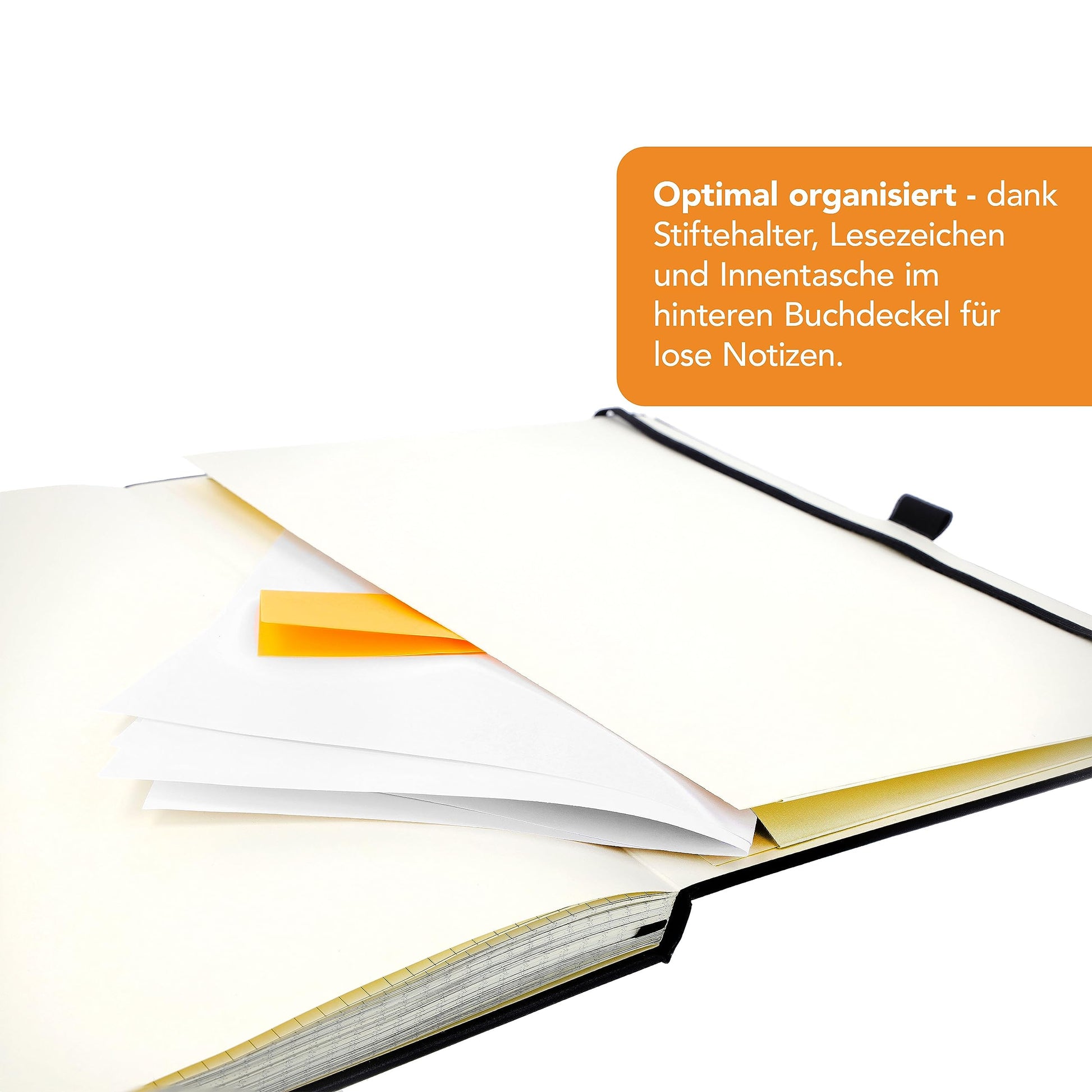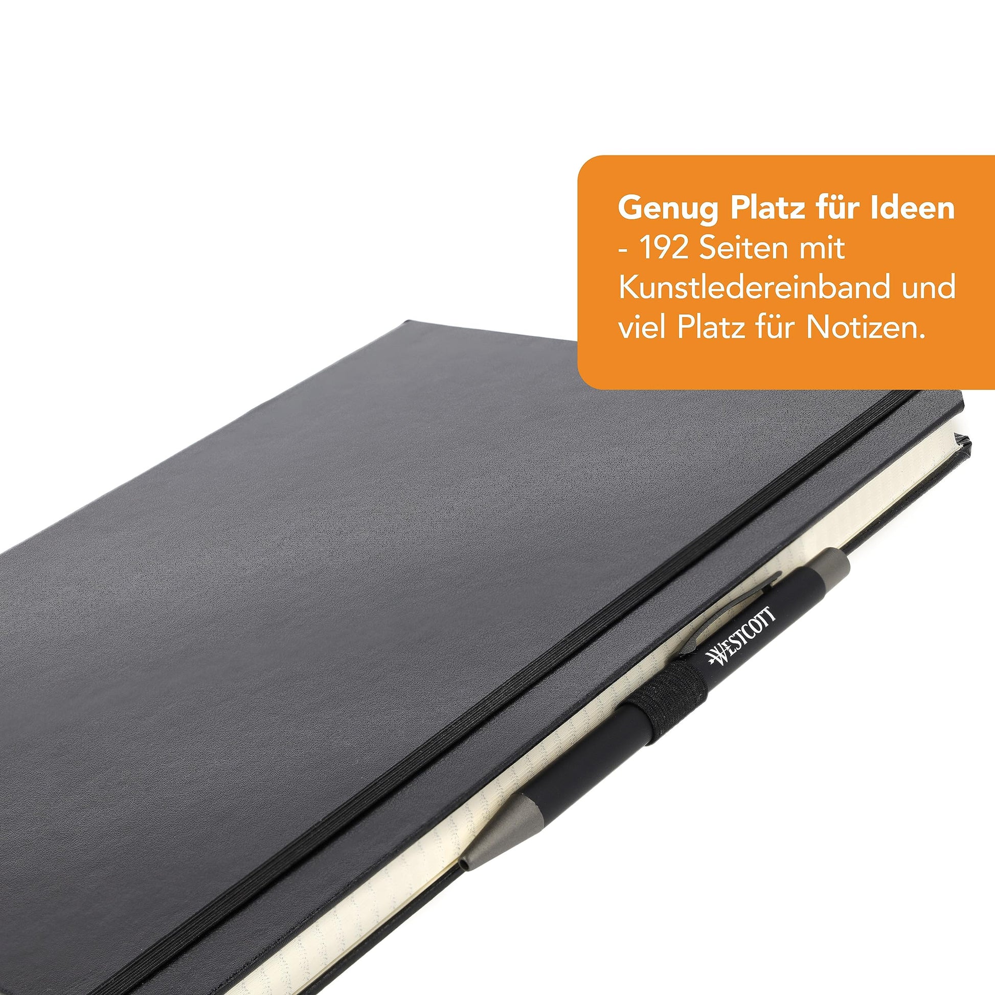 ["Product 1: Plenty of space for ideas - 96 A4 sheets with 192 pages well protected in a sturdy black faux leather cover with rounded corners provide ample space for notes, sketches, and memories.","Product 1: Optimal organization - thanks to pen holder, bookmark, and inner pocket in the back cover for loose notes. Please note that the pen holder is only suitable for pens up to 9mm in diameter.","Product 1: Particularly durable - The high-quality 80 gsm paper is made of environmentally friendly FSC mix paper in archival quality. The cover additionally protects the paper from air and light influences.","Product 1: Always with you - The notebook is versatile thanks to the squared pages and is suitable for use as a diary, travel journal, sketchbook, or notepad in school, university, or office.","Product 2: With high-quality push mechanism","Product 2: Lead size 0.5 mm","Product 2: Writing color blue, document-proof and refillable lead","Product 2: In ergonomic triangular shape with non-slip surface"]